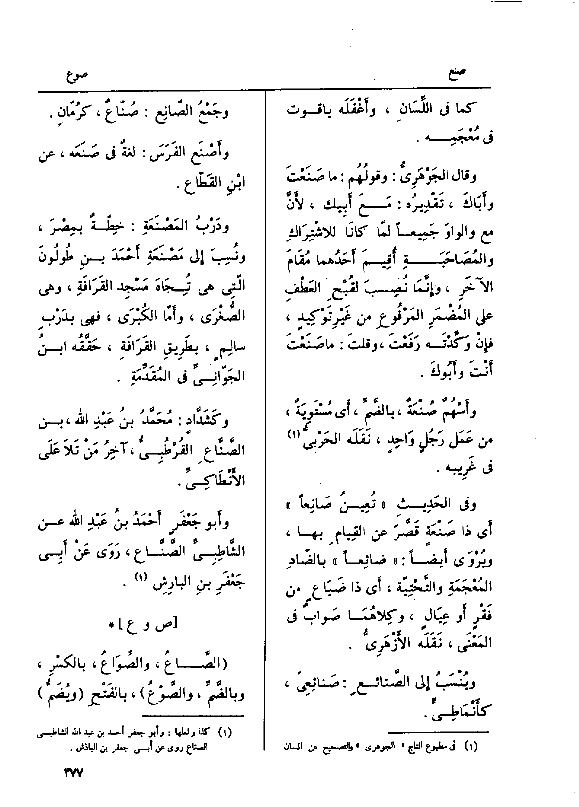 كَمَا فِي اللِّسان، وأَغْفَله ياقوت فِي مُعجَمِه. وَقَالَ الجَوْهَرِيّ، وقولُهم: مَا صَنَعْتَ وأباكَ، تقديرُه: مَعَ أَبِيك، لأنّ معَ والواوَ جَمِيعًا لمّا كَانَا للاشتراكِ والمُصاحَبةِ أُقيمَ أحَدُهما مُقامَ الآخَرِ، وإنّما نُصِبَ لقُبحِ العَطفِ على المُضمَرِ المَرفوعِ من غيرِ تَوْكِيدٍ، فإنْ وكَّدْتَه رَفَعْتَ، وقلتَ: مَا صَنَعْتَ أنتَ وأبوكَ. وأَسْهُمٌ صُنْعَةٌ، بالضَّمّ، أَي مُستَوِيَةٌ، من عملِ رجلٍ واحدٍ، نَقله الحَربيُّ فِي غَريبِه. وَفِي الحَدِيث: تُعينُ صانِعاً أَي ذَا صَنْعَةٍ قَصَّرَ عَن القيامِ بهَا، ويُروى أَيْضا: ضائِعاً بالضاد المُعجَمةِ والتحتيّة، أَي ذَا ضَياعٍ من فَقْرٍ أَو عِيالٍ، وَكِلَاهُمَا صَوابٌ فِي الْمَعْنى، نَقله الأَزْهَرِيّ. ويُنسَبُ إِلَى الصَّنائع: صَنائِعيّ، كَأَنْماطِيٍّ. وجَمعُ الصّانِع: صُنَّاعٌ، كرُمَّانٍ. وأَصْنَعَ الفرَسَ: لغةٌ فِي صَنَعَه، عَن ابنِ القَطّاع. ودَرْبُ المَصْنَعةِ: خِطَّةٌ بمِصر، ونُسِبَ إِلَى مَصْنَعةِ أحمدَ بنِ طُولونَ الَّتِي هِيَ تُجاهَ مَسْجِد القَرافَةِ، وَهِي الصُّغرى، وأمّا الكُبرى، فَهِيَ بدَربِ سالِمٍ، بطريقِ القَرافَة، حقَّقَه ابنُ الجَوَّانِيِّ فِي المُقَدِّمة. وَكَشَدَّادٍ: مُحَمَّد بنُ عَبْد الله، بن الصَّنَّاعِ القُرطُبيُّ، آخِرُ مَن تَلا على الأنْطاكِيِّ. وَأَبُو جَعْفَرٍ أحمدُ بنُ عَبْد الله عَن الشاطِبيِّ الصَّنَّاع، روى عَن أبي جَعْفَرِ بنِ البارِشِ.