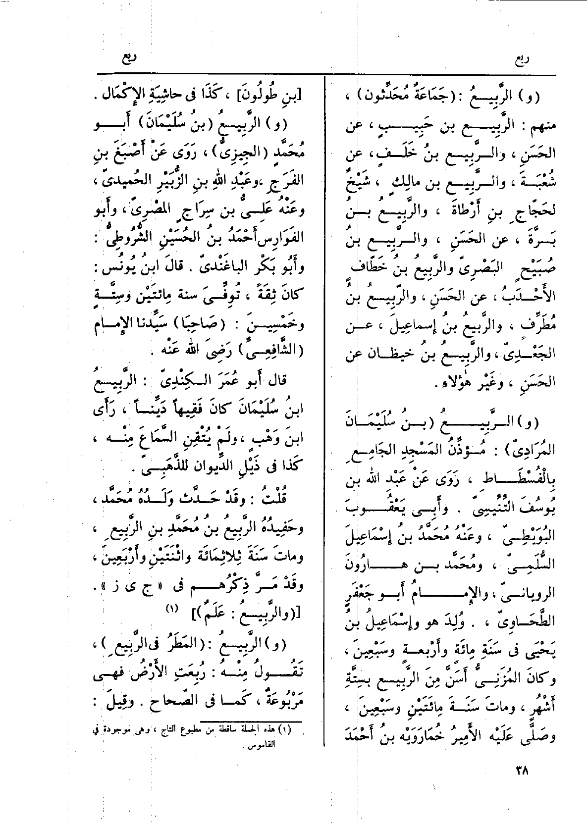 الرَّبيع: جَماعةٌ مُحَدِّثون، مِنْهُم: الرَّبيع بن حبيبٍ، عَن الحّسَنِ، والرَّبيع بن خَلَفٍ، عَن شُعْبَةَ، والرَّبيع بنُ مالِكٍ، شيخٌ لحَجَّاجِ بنِ أَرْطأةَ، والرَّبيع بن بَرَّةَ، عَن الحَسَنِ، والرَّبيع بنُ صُبَيْحٍ البَصريّ، والرَّبِيعُ بن خَطّاف الأَحْدَبُ، عَن الحَسَنِ، والرَّبيع بن مُطَرِّف، والرَّبيع بن إسماعيلَ، عَن الجَعْدِيّ، والرَّبيع بن خَيْظان، عَن الحَسَنِ، وغَير هَؤُلَاءِ. الرَّبيع بنُ سليمانَ المُرادِيّ: مؤَذِّن المَسْجِدِ الْجَامِع بالفُسطاطِ، روَى عَن عَبْد الله بن يُوسُف التِّنِّيسيّ. وأَبي يَعقوبَ البُوَيْطِيّ، وَعنهُ محمّد بن إسماعيلَ السُّلَمِيّ، ومحمّد بن هارونَ الرويانيّ، وَالْإِمَام أَبو جَعفَرٍ الطَّحاوِيّ، وُلِدَ هُوَ وإسماعيلُ بنُ يَحيى فِي سنة مائةٍ وأَربعةٍ وسَبعينَ، وكانَ المُزَنِيُّ أَسَنَّ من الرَّبيع بستَّةِ أَشْهُرٍ، وَمَات سنةَ مِائَتَيْنِ وسبعينَ، وصلَّى عَلَيْهِ الأَميرُ خُمارَوَيه بنُ أَحمدَ بنِ طولونَ، كَذَا فِي حَاشِيَة الْإِكْمَال. الرَّبيع بنُ سليمانَ أَبو محمّدٍ الجِيزِيُّ، روَى عَن أَصْبَغَ بنِ الفرَجِ، وعَبْد الله بن الزَّبَيْرِ الحُمَيدِيّ، وَعنهُ علِيُّ بن سِراجٍ المصريّ، وأَبو الفوارس أَحمدُ بنُ الْحُسَيْن الشُّروطِيُّ. وأَبو بَكر الباغَنْدِيّ. قَالَ ابنُ يونُس: كَانَ ثِقَةً، توفِّيَ سنةَ مِائَتَيْنِ وستَّةٍ وخمسينَ: صاحِبا سيِّدنا الإِمَام الشَّافِعِيِّ رَضِي الله عَنهُ. قَالَ أَبو عُمَر الكِنْدِيّ: الرَّبيع بنُ سليمانَ كَانَ فَقِيها دَيِّناً، رأَى ابنَ وَهْبٍ، ولمْ يُتْقِنِ السَّماعَ مِنْهُ، كَذَا فِي ذَيلِ الدِّيوان للذَّهبيّ. قلتُ: وَقد حَدَّث ولدُه محمّد، وحفيدُه الرَّبيع بنُ محمّد بن الرَّبيع، وَمَات سنة ثَلَاثمِائَة واثنتين وأَربعينَ، وَقد مَرَّ ذِكرُهم فِي جى ز. والرَّبيعُ: عَلَمٌ. الرَّبيعُ: المَطَرُ فِي الرَّبيع، تَقولُ منهُ: رُبِعَتِ الأَرْضُ فَهِيَ مَرْبُوعَةٌ، كَمَا فِي الصِّحاح. وَقيل: الرَّبيعُ:
