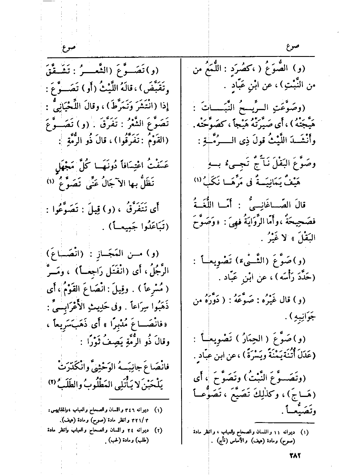 قَالَ الصَّاغانِيّ: أما اللُّغَة فصَحيحةٌ، وأمّا الروايةُ فَهِيَ: وصَوَّحَ البَقلَ لَا غيرُ. (و) } صوَّعَ الشيءَ {تَصْوِيعاً: حدَّدَ رَأْسَه، عَن ابنِ عبّادٍ. قَالَ غيرُه:} صوَّعَه: دَوَّرَه من جَوانبِه. صوَّعَ الحمارُ تَصْوِيعاً: عَدَلَ أُتُنَه يَمْنَةً ويَسْرَةً، عَن ابنِ عبّادٍ. وَ {تَصَوَّعَ النبتُ وَتَصَوَّحَ، أَي هاجَ، وَكَذَلِكَ} تصَيَّعَ، {تصَوُّعاً} وتصَيُّعاً. (و) {تصَوَّعَ الشَّعرُ: تشَقَّقَ وَتَقَبَّضَ، قَالَه الليثُ أَو تصوَّعَ: إِذا انتشرَ وَتَمَرَّطَ، وَقَالَ اللِّحْيانيُّ: تصَوَّعَ الشَّعرُ: تفرَّق. تصوَّعَ القومُ: تفرَّقوا، قَالَ ذُو الرُّمَّة: