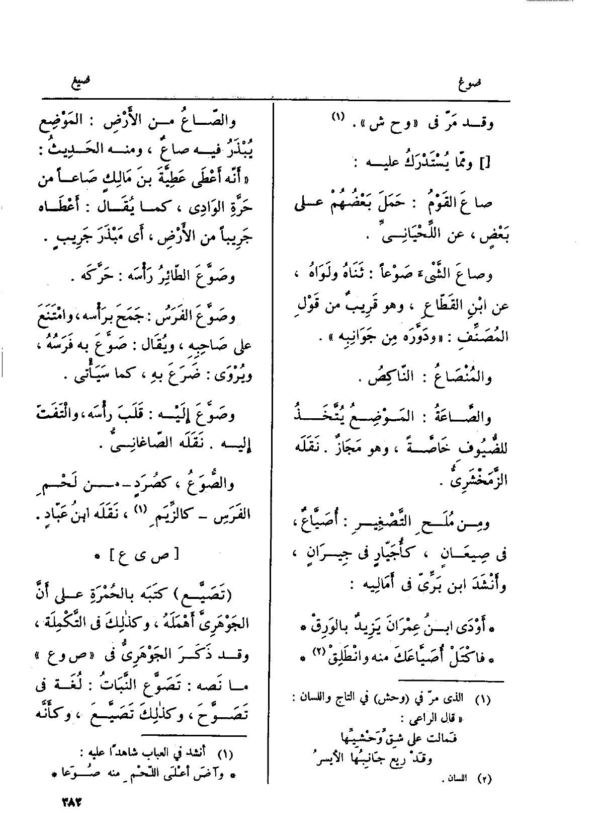 وَقد مرَّ فِي وَحش. ومِمّا يُسْتَدْرَك عَلَيْهِ: صاعَ القومُ: حَمَلَ بعضُهم على بعضٍ، عَن اللحيانيِّ. وصاعَ الشيءَ {صَوْعَاً: ثَناه ولَواه، عَن ابنِ القَطّاع، وَهُوَ قريبٌ من قَوْلِ المُصَنِّف: ودَوَّرَه من جوانبِه.} والمُنْصاعُ: الناكِص. {والصاعة: الموضعُ يُتَّخَذُ للضيوفِ خاصّةً، وَهُوَ مَجاز، نَقله الزَّمَخْشَرِيّ. وَمن مُلَحِ التصغير:} أُصَيَّاعٌ، فِي {صِيعانٍ، كأُجَيَّارٍ فِي جِيرانٍ، وأنشدَ ابنُ بَرِّيّ فِي أَمَالِيهِ:
