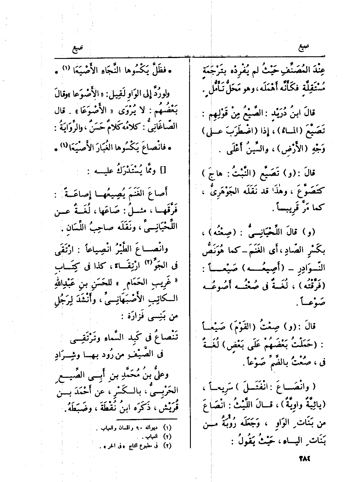 عِنْد المُصَنِّف حيثُ لم يُفرِدْه بتَرجمَةٍ مُستَقِلّةٍ فكأنّه أهمله، وَهُوَ محلُّ تأمُّلٍ. قَالَ ابْن دُرَيْدٍ: {الصَّيْعُ من قولِهم: تصَيَّعَ الماءُ، إِذا اضطربَ على وجهِ الأرضِ، والسينُ أَعلَى. قَالَ: (و) } تصَيَّعَ النباتُ: هاجَ {كَتَصَوَّعَ، وَهَذَا قد نَقَلَه الجَوْهَرِيّ، كَمَا مرَّ قَرِيبا. قَالَ اللِّحْيانيُّ:} صِعْتُه، بكسرِ الصادِ، أَي الغنَمِ كَمَا هُوَ نصُّ النوادرِ {أَصيعُه صَيْعَاً: فرَّقتُه، لغةٌ فِي} صُعتُه {أَصوعُه} صَوْعَاً. قَالَ: (و) {صِعْتُ القومَ} صَيْعَاً: حَمَلْتُ بعضَهم على بعضٍ لغةٌ فِي {صُعتُ بالضَّمّ صَوْعَاً.} وانْصاعَ: انْفَتلَ سَريعاً، يائِيَّةٌ واوِيَّةٌ، قَالَ الليثُ: {انْصاعَ من بَناتِ الْوَاو، وَجَعَله رُؤْبَةُ من بناتِ الياءِ، حيثُ يَقُول: فظَلَّ يَكْسوها النَّجاءَ} الأَصْيَعا وَلَو رُدَّ إِلَى الواوِ لقيل: الأَصْوَعا وَقَالَ بعضُهم: لَا يُروى {الأصْوَعا. قَالَ الصَّاغانِيّ: كلامُه كلامٌ حسَنٌ، والروايةُ:} فانْصاعَ يَكسوها الغُبارَ الأَصْيَعا ومِمّا يُسْتَدْرَك عَلَيْهِ: {أصاعَ الغنَمَ} يُصيعُها {إصاعَةً: فرَّقَها، مثلُ:} صاعَها، لغةٌ عَن اللِّحْيانيِّ،)