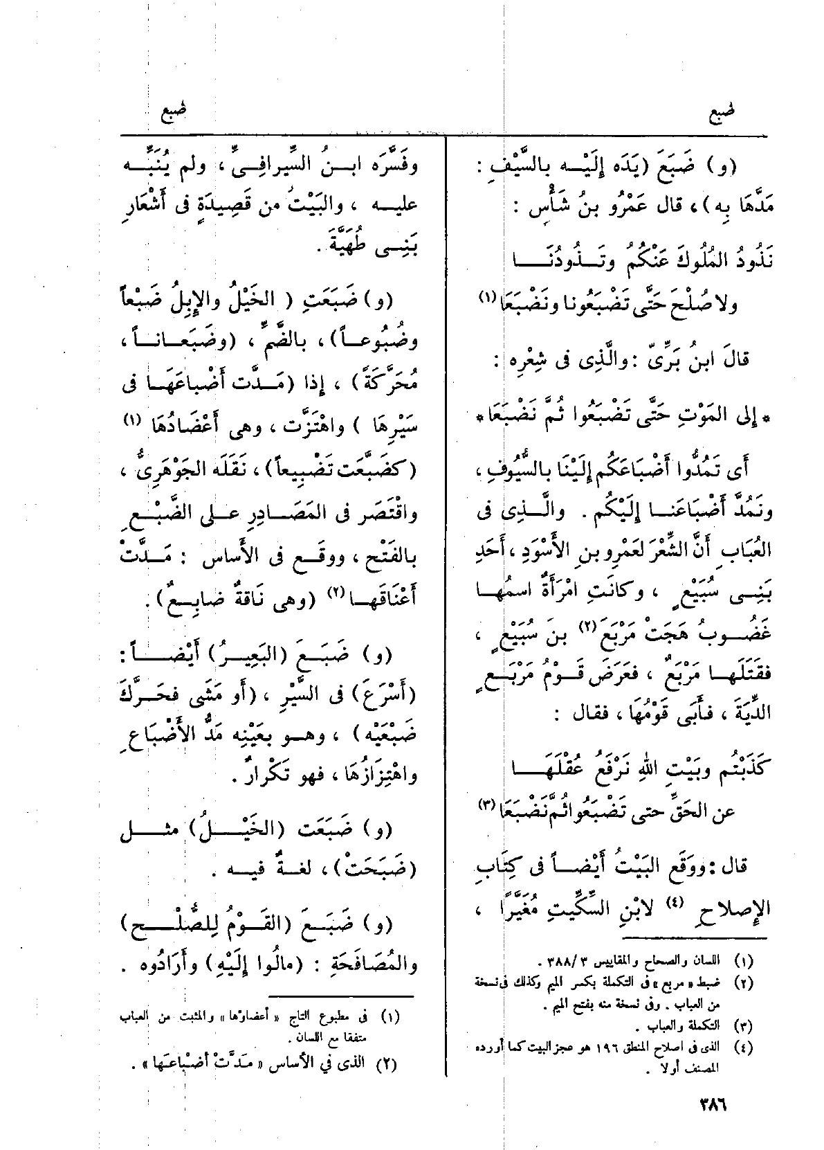قَالَ: وَوَقَع البيتُ أَيْضا فِي كتابِ الإصلاحِ لِابْنِ السِّكِّيت مُغَيَّراً. وفسَّرَه ابنُ السِّيرافيِّ، وَلم يُنَبِّه عَلَيْهِ، والبيتُ من قصيدةٍ فِي أشعارِ بَني طُهَيَّةَ. ضَبَعَتِ الخَيلُ والإبلُ ضَبْعَاً وضُبوعاً، بالضَّمّ، وضَبَعَاناً، مُحرّكةً، إِذا مَدَّت أَضْبَاعَها فِي سَيْرِها واهْتَزَّت، وَهِي أعضادُها كضَبَّعَت تَضْبِيعاً، نَقله الجَوْهَرِيّ، واقتصرَ فِي المصادرِ على الضَّبْعِ بالفَتْح، ووقعَ فِي الأساس: مَدَّتْ أَعْنَاقَها وَهِي ناقةٌ ضابِعٌ. ضَبَعَ البعيرُ أَيْضا: أَسْرَعَ فِي السَّيرِ، أَو مَشى فحرَّكَ ضَبْعَيْه، وَهُوَ بعَينِه مَدُّ الأَضْباعِ واهتِزازُها، فَهُوَ تَكْرَارٌ. ضَبَعَت الخَيلُ مثل ضَبَحَتْ، لغةٌ فِيهِ. ضَبَعَ القومُ للصُّلْحِ والمُصَافَحةِ: مالوا إِلَيْهِ وأرادوه.