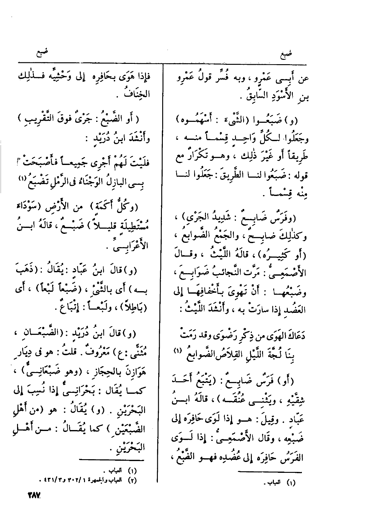 عَن أبي عمروٍ، وَبِه فُسِّرَ قولُ عَمْرِو بنِ الأسوَدِ السَّابِق. ضَبَعوا الشيءَ: أَسْهَموه وَجعلُوا لكلِّ واحدٍ قِسْماً مِنْهُ، طَريقاً أَو غيرَ ذَلِك، وَهُوَ تَكْرَارٌ مَعَ قولِه: ضبَعوا لنا الطريقَ: جعلُوا لنا مِنْهُ قِسْماً. وفرَسٌ ضابِعٌ: شديدُ الجَرْيِ، وَكَذَلِكَ ضابِحٌ، والجَمعُ الضَّوابِع، أَو كثيرُه، قَالَه الليثُ، وَقَالَ الأَصْمَعِيّ: مرَّتْ النَّجائبُ ضَوابِعَ، وضَبْعُها: أَن تَهْوِيَ بأَخْفافِها إِلَى العَضُدِ إِذا سارتْ بِهِ، وأنشدَ الليثُ: