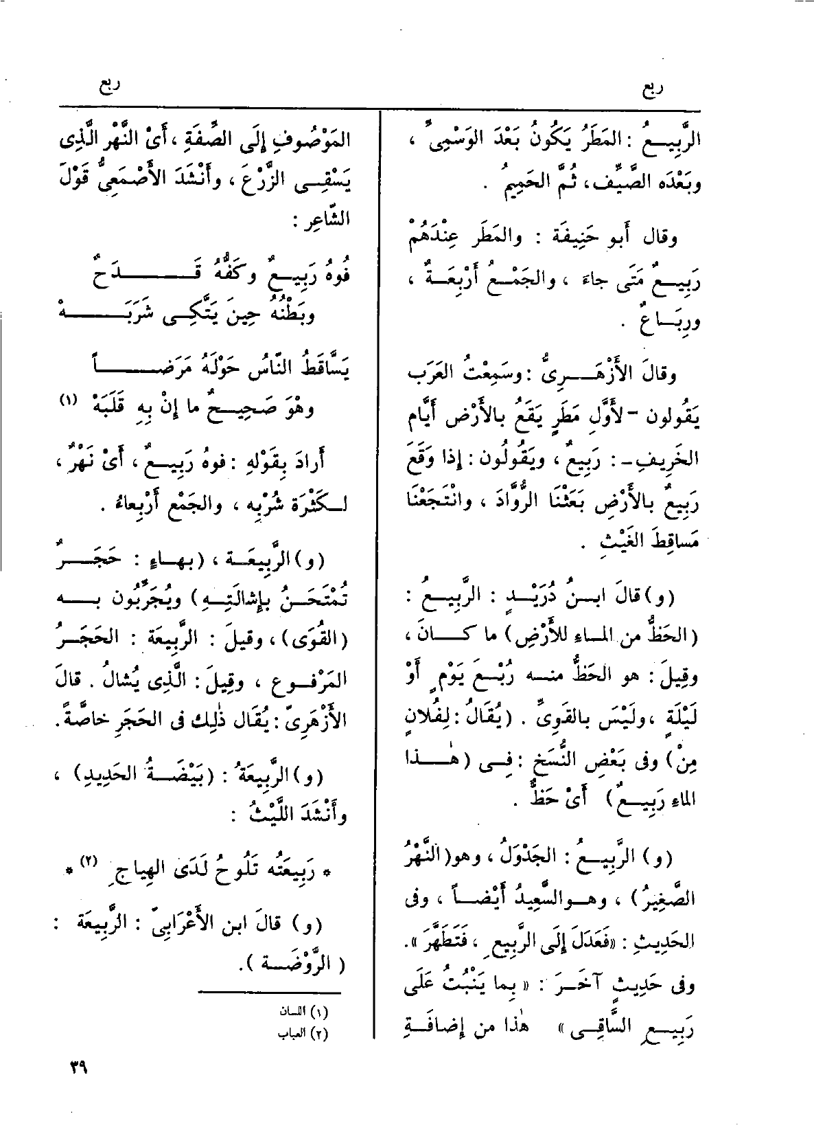المَطَرُ يكونُ بعدَ الوَسْمِيِّ، وَبعده الصَّيْف، ثمَّ الحَميمُ. وَقَالَ أَبو حنيفَة: والمَطَرُ عندَهم رَبيعٌ مَتى جاءَ، والجَمْعُ أَرْبِعَةٌ، ورِباعٌ. وَقَالَ الأَزْهَرِيّ: وسَمِعْتُ العَرَب يَقُولُونَ لأَوَّل مَطَرٍ يَقع بالأَرضِ أَيّام الخريف: رَبيعٌ، وَيَقُولُونَ إِذا وقَعَ رَبيعٌ بالأَرضِ بَعَثْنا الرُّوَّادَ، وانْتَجَعْنا مَساقِطَ الغَيْثِ. قَالَ ابْن دُرَيد: الرَّبيعُ: الحَظُّ من الماءِ للأرضِ مَا كانَ، وَقيل: هُوَ الحَظُّ مِنْهُ رُبْعَ يَومٍ أَو ليلَةٍ، وَلَيْسَ بالقَوِيِّ. يُقالُ: لفلانٍ مِنْ، وَفِي بعضِ النُّسَخ: فِي هَذَا المَاء رَبيعٌ، أَي حَظٌّ. الرَّبيعُ: الجَدْوَلُ، وَهُوَ النَّهر الصَّغير، وَهُوَ السَّعيدُ أَيضاً. وَفِي الحَدِيث: فعَدَلَ إِلَى الرَّبيعِ فتَطَهَّرَ. وَفِي حديثٍ آخرَ: بِمَا يَنْبُتُ على رَبيعِ السَّاقِي، هَذَا من إِضَافَة الموصوفِ إِلَى الصِّفَةِ، أَي النَّهر الَّذِي)