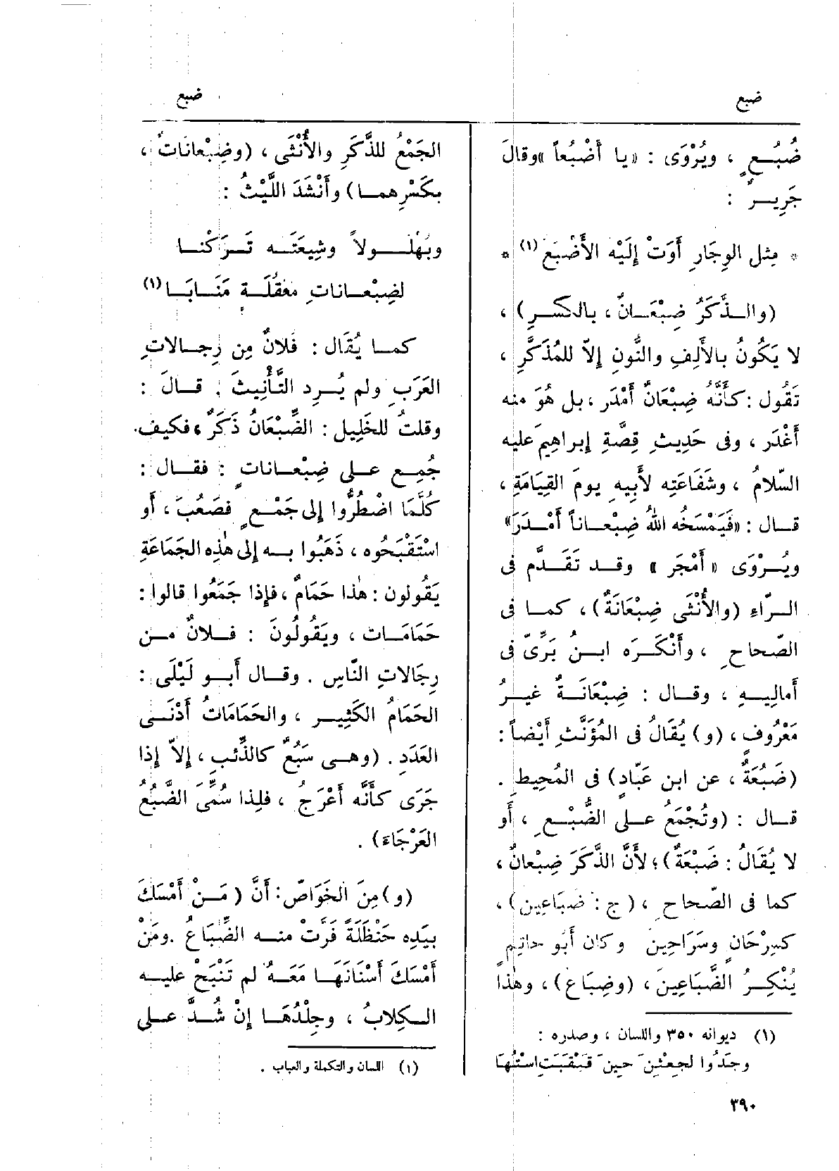 كَمَا يُقَال: فلانٌ من رِجالاتِ العربِ وَلم يُرِد التأنيثِ. قَالَ: وقلتُ للخليلِ: الضَّبْعانُ ذَكَرٌ، فَكيف جُمِعَ على ضِبْعاناتٍ، فَقَالَ: كلّما اضْطُرُّوا إِلَى جَمعٍ فصَعُبَ، أَو اسْتَقبَحوه، ذَهَبُوا بِهِ إِلَى هَذِه الجماعةِ يَقُولُونَ: هَذَا حَمامٌ، فَإِذا جمَعوا قَالُوا: حمامات، وَيَقُولُونَ: فلانٌ من رِجالات الناسِ.