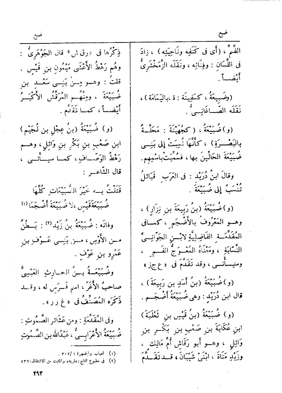 وفاتَه: ضُبَيْعةُ بنُ زَيْد: بطنٌ من الأوسِ، من بَني عَوْفِ بنِ عَمْرِو بنِ عَوْفٍ. وضُبَيْعةُ بنُ الحارثِ العَبسيُّ صاحبُ الأغَرّ، اسمُ فرَسٍ لَهُ، وَقد ذَكَرَه المُصَنِّف فِي غرر. وَفِي المُقدِّمة: وَمن عَشائرِ الصَّمُوتِ: ضُبَيْعةُ الأعرابيّ، عَبْد الله بن الصَّمُوتِ