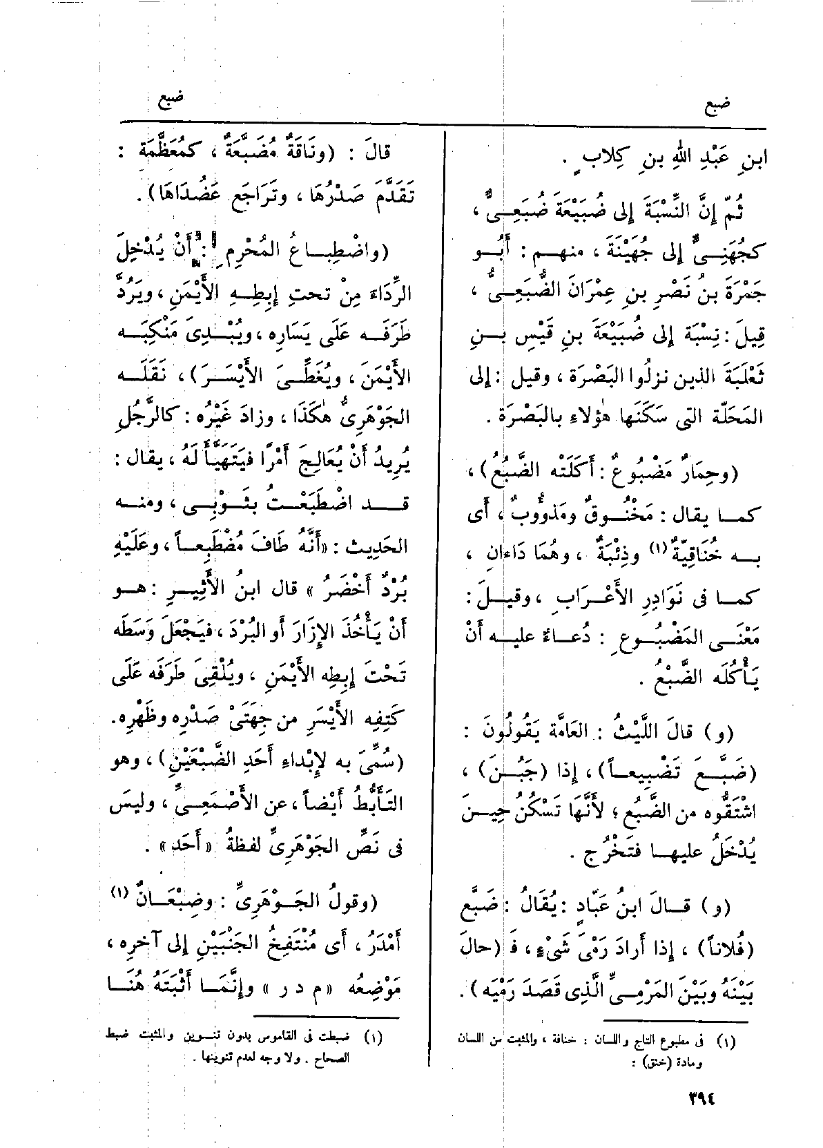 بنِ عَبْد الله بنِ كِلابٍ. ثمّ إنّ النِّسبةَ إِلَى ضُبَيْعة ضُبَعِيٌّ، كجُهَنِيٍّ إِلَى جُهَيْنةَ، مِنْهُم: أَبُو جَمْرَةَ بنُ نَصْرِ بنِ عِمْرانَ الضُّبَعيُّ، قيل: نِسبَة إِلَى ضُبَيْعة بنِ قَيْسِ بنِ ثَعْلَبةَ الَّذين نزلُوا البَصْرة، وَقيل: إِلَى المحَلّة الَّتِي سَكَنَها هؤلاءِ بالبَصْرة. وحمارٌ مَضْبُوعٌ: أَكَلَتْه الضَّبُعُ، كَمَا يُقَال: مَخْنُوقٌ ومَذْؤُوبٌ، أَي بِهِ خُنَّاقِيّةٌ وذِئبَةٌ، وهما داءان، كَمَا فِي نوادرِ الْأَعْرَاب، وَقيل: معنى المَضْبوع: دُعاءٌ عَلَيْهِ أَن يَأْكُلَه الضَّبْعُ. قَالَ الليثُ: العامّةُ يَقُولُونَ: ضَبَّعَ تَضْبِيعاً، إِذا جَبُنَ، اشتَقُّوه من الضَّبُعِ لأنّها تَسْكُنُ حينَ يُدخَلُ عَلَيْهَا فتَخرُج. قَالَ ابْن عَبَّادٍ: يُقَال: ضَبَّعَ فلَانا، إِذا أرادَ رَمْيَ شيءٍ، فحالَ بَيْنَه وبَيْنَ المَرمى الَّذِي قَصَدَ رَمْيَه. قَالَ: وناقةٌ مُضَبَّعةٌ، كمُعَظَّمةٍ: تقدّمَ صَدْرُها، وتراجَعِ عَضُداها.