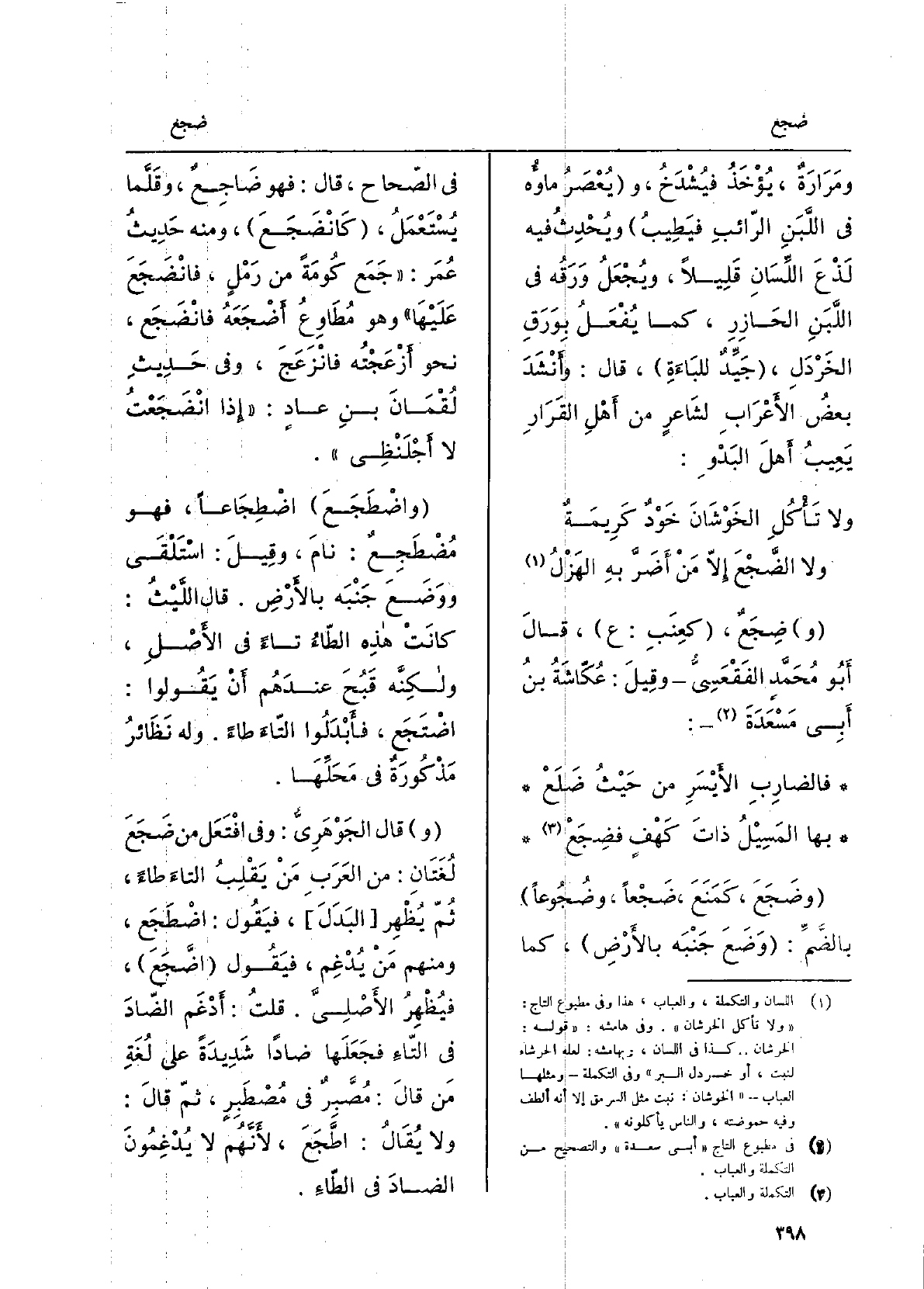 قَالَ الليثُ: كَانَت هَذِه الطَّاءُ تَاء فِي الأَصلِ، ولكنَّه قَبُحَ عندَهُم أَن يَقُولُوا: اضْتَجَعَ، فأَبدَلوا التَّاءَ طاءً، وَله نظائرُ مَذكورَةٌ فِي مَحلِّها. قَالَ الجَوْهَرِيُّ: وَفِي افْتَعَلَ مِن ضَجَعَ لُغتانِ: من العرَبِ مَنْ يَقلِبُ التَّاءَ طاءً، ثمَّ يُظْهِرُ البدَلَ، فَيَقُول: اضْطَجَعَ، وَمِنْهُم من يُدغِمُ، فَيَقُول: اضَّجَعَ، فيُظهِرُ الأَصلِيَّ. قلتُ: أَدغمَ الضَّادَ فِي التّاءِ فجعلَها ضاداً شَدِيدَة على لغةِ مَن قَالَ: مُصَّبِرٌ فِي مُصْطَبِرٍ، ثمَّ قَالَ: وَلَا يُقال: اطَّجَعَ، لأَنَّهُم لَا يُدغِمونَ الضَّادَ فِي الطَّاءِ.