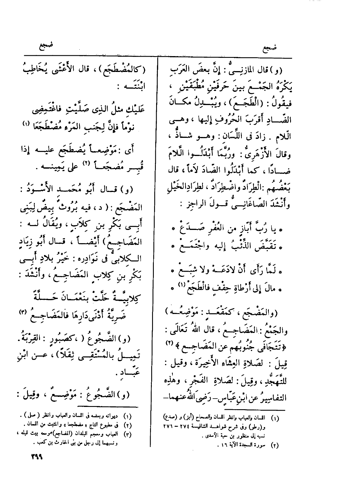 المَضاجِعِ قيل: لِصلاةِ العِشاءِ الأَخيرَةِ، وَقيل: للتَهَجُّدِ، وَقيل: لِصلاةِ الفَجْرِ، وَهَذِه التَّفاسيرُ عَن ابنِ عّبّاسٍ رَضِي الله عَنْهُمَا، كالمضطجع، قَالَ الأَعشَى يُخاطِبُ ابنتَه:
