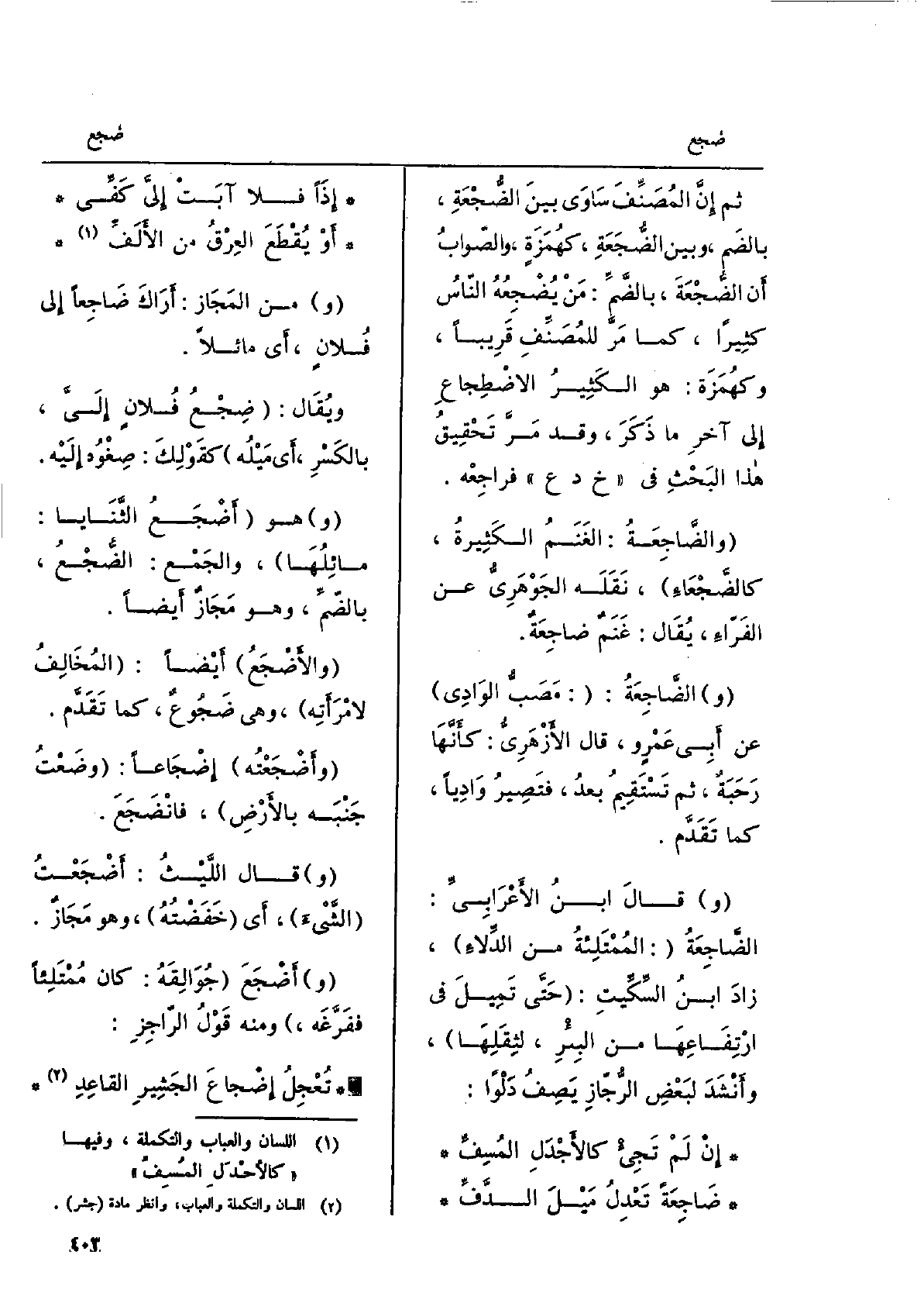 الضُّجْعَةِ، بالضَّمِّ، وبينَ الضُّجَعَةِ، كهُمَزَةٍ، والصّوابُ أَنَّ الضُّجْعَةَ، بالضَّمِّ: مَن يُضْجِعُه النّاسُ كثيرا، كَمَا مَرَّ للمصنِّف قَرِيبا، وكهُمزَة: هُوَ الْكثير الِاضْطِجَاع إِلَى آخِر مَا ذَكَرَ، وَقد مَرَّ تحقيقُ هَذَا البحثِ فِي خدع فراجِعْه. والضَّاجِعَةُ: الغَنَمُ الكثيرَةُ، كالضَّجْعاءِ، نَقله الجَوْهَرِيّ عَن الفَرَّاءِ، يُقال: غَنَمٌ ضاجِعَةٌ. الضَّاجِعَةُ: مَصَبُّ الْوَادي، عَن أَبي عَمروٍ، قَالَ الأَزْهَرِيّ: كأَنَّها رَحَبَةٌ، ثمَّ تستقيمُ بعدُ، فتصيرُ وادِياً، كَمَا تقدَّم. قَالَ ابْن الأَعْرابِيِّ: الضَّاجِعَةُ: المُمْتلئة من الدِّلاءِ، زادَ ابنُ السِّكِّيتِ: حتّى تَميلَ فِي ارتفاعِها من البئرِ، لِثِقَلِها، وأَنشدَ لبعضِ الرُّجَّازِ يصفُ دَلواً: