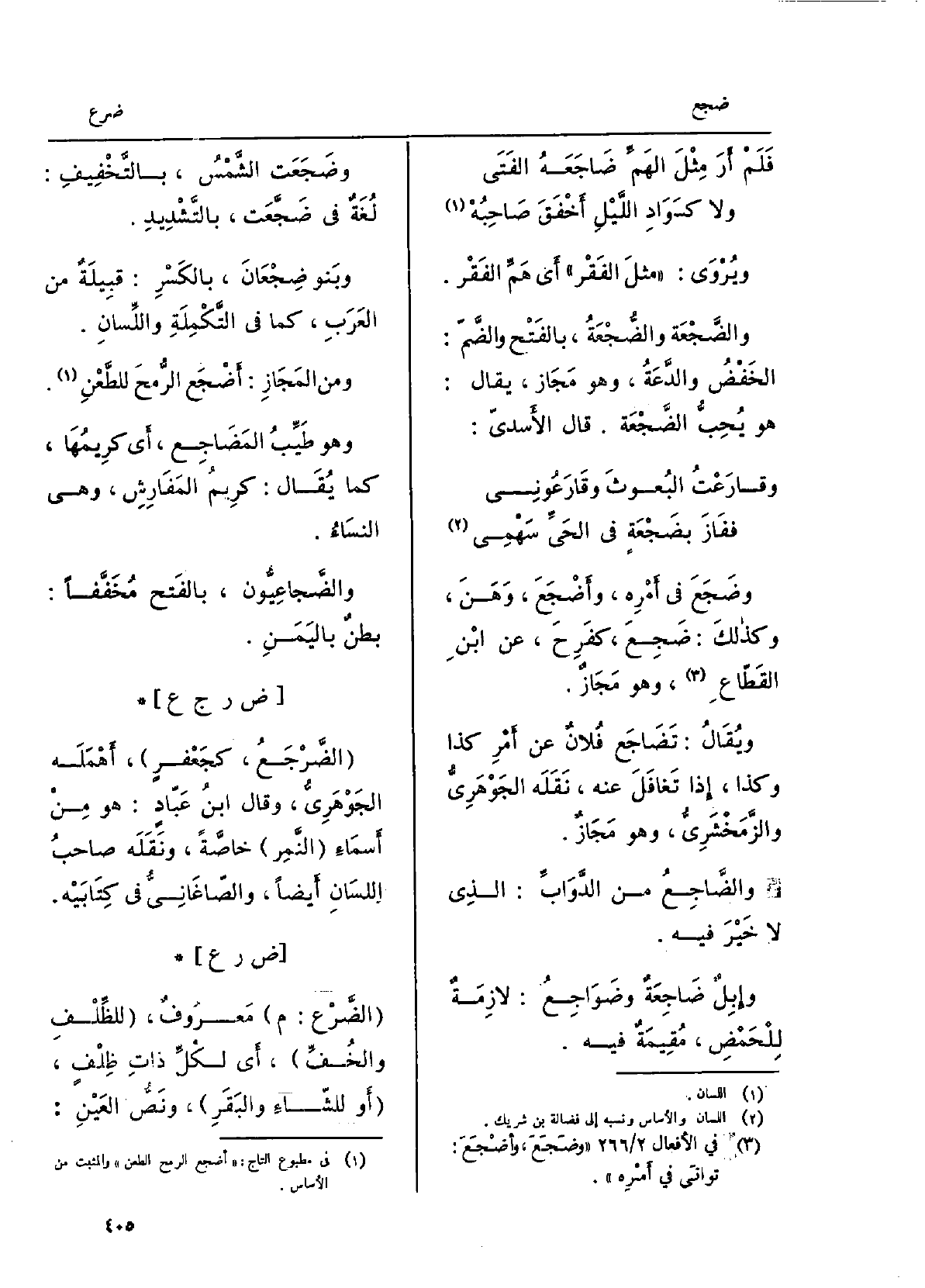 وضَجَعت الشَّمسُ، بالتَّخفيفِ: لغةٌ فِي ضَجَّعَت، بالتَّشديد. وبَنو ضِجعانَ، بالكَسر: قبيلةٌ من العرَبِ، كَمَا فِي التَّكملَةِ واللِّسان. منَ المَجاز: أَضْجَعَ الرُّمْحَ للطَّعنِ. وَهُوَ طَيِّبُ المَضاجِعِ، أَي كَريمُها، كَمَا يُقال: كريمُ المَفارِشِ، وَهِي النِّساءُ. والضَّجاعِيُّون، بِالْفَتْح مُخَفَّفاً: بَطْنٌ باليَمَنِ.