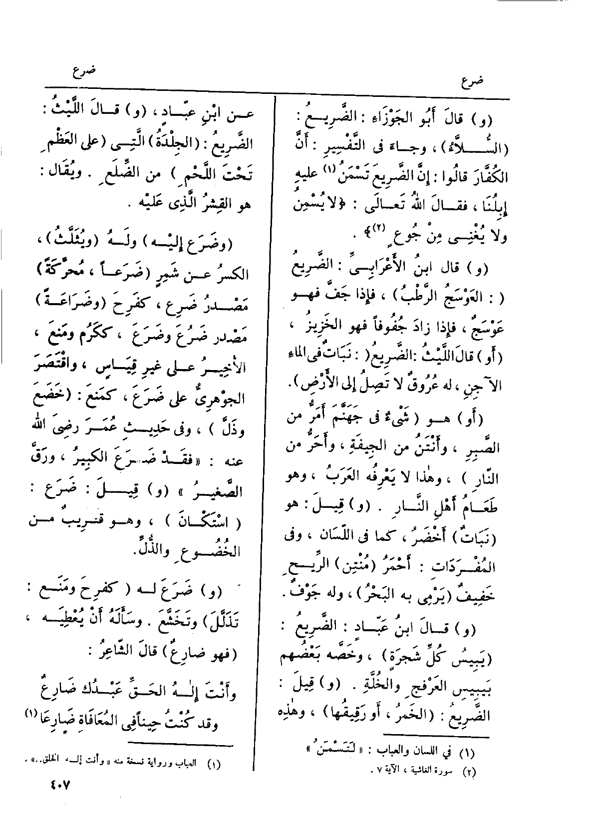 الجيفَةِ، وأَحرُّ من النّارِ، وَهَذَا لَا يعرِفُه العَرَبُ، وَهُوَ طَعامُ أَهلِ النّارِ. قيل: هُوَ نباتٌ أَخضَرُ، كَمَا فِي اللِّسان، وَفِي المُفرداتِ: أَحمَرُ مُنتِن الرِّيحِ خفيفٌ يَرمي بِهِ البَحرُ، وَله جَوفٌ. قَالَ ابْن عَبّادٍ: الضَّريعُ: يَبيسُ كلِّ شَجرَةٍ، وخَصَّه بعضُهُم بيبيسِ العَرْفَجِ والخُلَّةِ. قيل: الضَّريعُ: الخَمْرُ أَو رَقيقُها، وَهَذِه عَن ابْن عبادٍ، قَالَ الليثُ: الضَّريعُ: الجِلدَةُ الَّتِي على العَظْمِ تحتَ اللَّحمِ من الضِّلْعِ. وَيُقَال: هُوَ القِشْرُ الَّذِي عَلَيْهِ. وضَرَعَ إِلَيْهِ، ولَهُ، ويُثَلَّثُ، الكسرُ عَن شَمِرٍ ضَرَعاً، مُحَرَّكَةً، مَصدرُ ضَرِعَ، كفَرِحَ، وضَراعَةً، مدر ضَرُعَ وضَرَع، ككَرُمَ ومَنَعَ، الأَخير على غير قِياسٍ، واقتصرَ الجَوْهَرِيّ على ضَرَعَ، كمَنَعَ: خضَعَ وذَلَّ، وَفِي حَدِيث عُمر رَضِي الله عَنهُ: فقد ضَرَعَ الكبيرُ، ورَقَّ الصَّغيرُ. قيل: ضَرَعَ: اسْتَكانَ، وَهُوَ قريب من الخضوعِ والذُلِّ. ضَرَع لَهُ، كفَرِحَ ومَنَعَ: تذَلَّلَ وتَخَشَّعَ، وسأَلَه أَن يُعطِيَهُ، فَهُوَ ضارِعٌ، قَالَ الشَّاعِر: