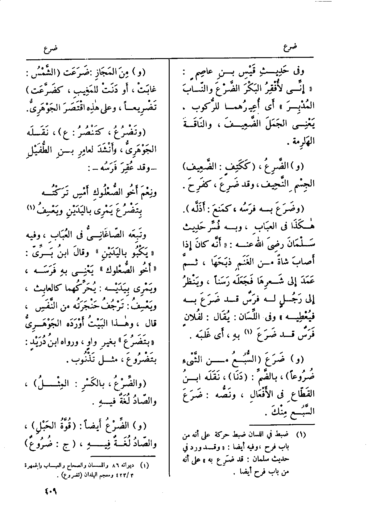 وَفِي حديثِ قيس بنِ عاصِمٍ: إنِّي لأُفْقِرَ البَكْرَ الضَّرْعَ والنّابَ المُدْبِرَ، أَي أُعيرُهما للرُّكوبِ، يَعْنِي الجَمَلَ الضَّعيفَ، والنّاقةَ الهَرِمَة. الضَّرِعُ، ككَتِفٍ: الضَّعيفُ الجِسمِ النَّحيف، وَقد ضَرِعَ، كفَرِحَ. وضَرَعَ بِهِ فرَسُهُ، كمَنَعَ: أَذَلَّه. هَكَذَا فِي العُبابِ، وَبِه فُسِّرَ حديثُ سَلمانَ رَضِي الله عَنهُ: أَنَّه إِذا كانَ أَصابَ شَاة مِمَّن الغَنَمِ ذبحَها، ثمَّ عمدَ إِلَى شَعرِها فجعلَه رسَناً، وينظُرُ إِلَى رَجُلٍ لهُ فَرَسٌ قد ضَرَعَ بِهِ فيُعطيه. وَفِي اللِّسان يُقال: لِفلانٍ فَرَسٌ قد ضَرَعَ بهِ، أَي غلبَه. ضَرَعَ السَّبُعُ من الشيءِ ضُروعاً، بالضَّمِّ: دَنا، نَقله ابنُ القَطَّاعِ فِي الأَفعالِ، ونّصُّه: ضَرَعَ السَّبُعَ مِنكَ. منَ المَجاز: ضَرَعَتِ الشَّمسُ: غابَتْ، أَو دَنَتْ للمَغيبِ، كضَرَّعَت تَضريعاً، وعَلى هَذِه اقتصَرَ الجَوْهَرِيُّ. وتَضْرُعُ، كتَنْصُرُ: ع، نَقله الجَوْهَرِيُّ، وأَنشدَ لعامِر بنِ الطُّفَيْلِ وَقد عُقِرَ فرَسُهُ: