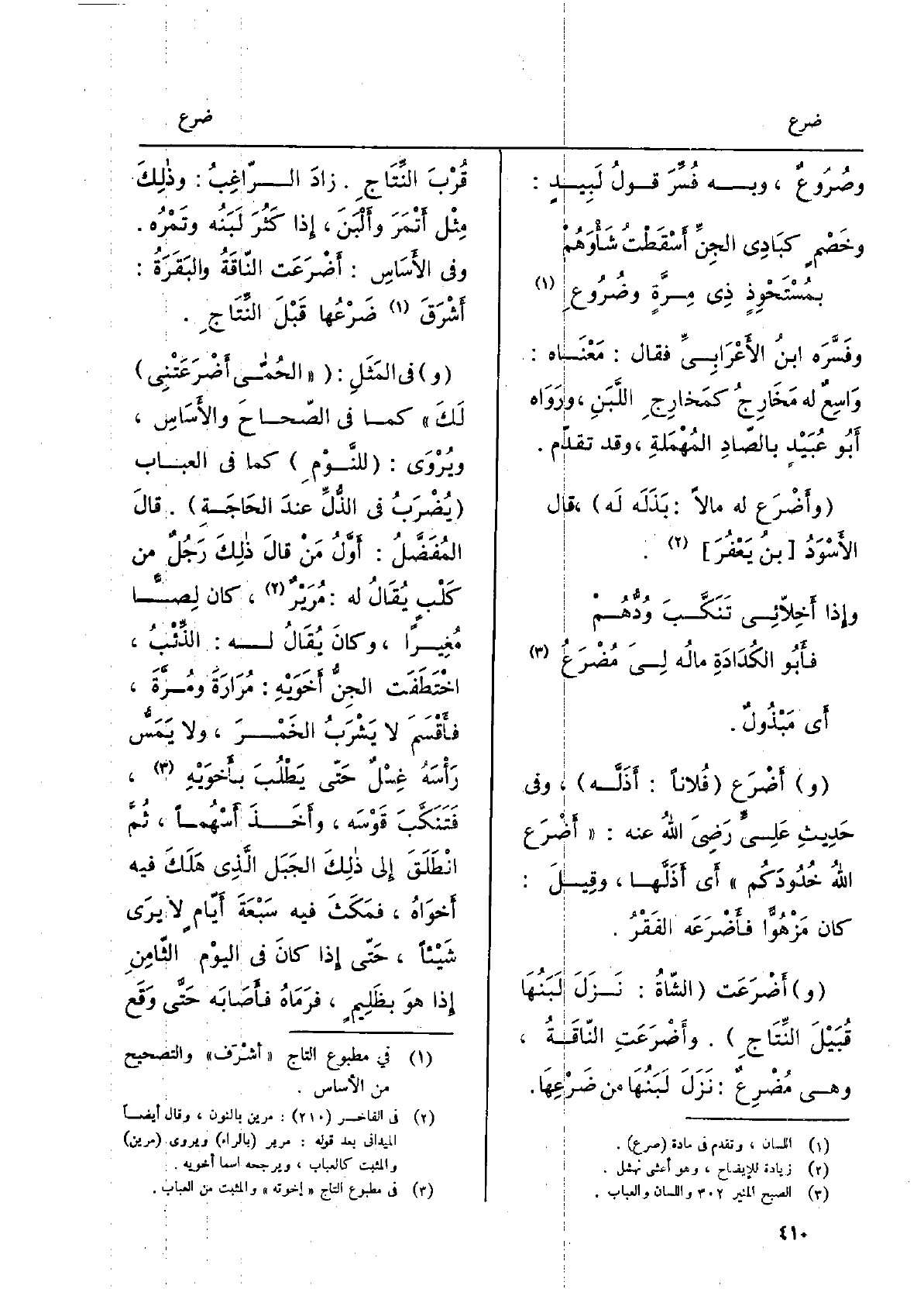 وفسَّرَه ابنُ الأَعرابيِّ فَقَالَ: مَعْنَاهُ: واسِعٌ لَهُ مَخارِجُ كمَخارِجِ اللَّبَنِ، ورواهُ أَبو عُبيدٍ بالصَّادِ المُهملَةِ، وَقد تقدَّم. وأَضْرَعَ لَهُ مَالا: بذلَه لَهُ، قَالَ الأَسودُ بنُ يَعفُرَ: