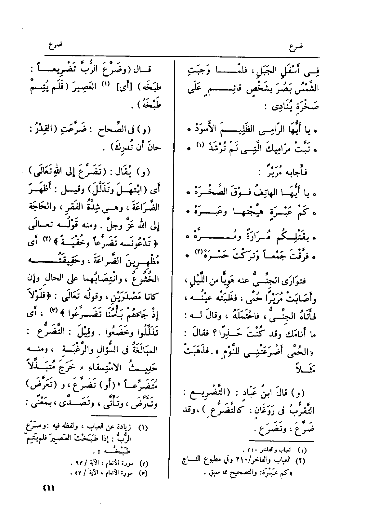 فتوارى الجِنِّيُّ عَنهُ هَوِيّاً من اللَّيْل، وأَصابَتْ مُرَيراً حُمّىً، فغلبَتْهُ عينه، فأَتاهُ الجِنِّيُّ، فاحتملَهُ، وَقَالَ لَهُ: مَا أَنامَكَ وَقد كنتَ حَذِراً فَقَالَ: الحُمَّى أَضْرَعَتْني لِلنَّوْمِ. فذَهَبَتْ مَثلاً. قَالَ ابنُ عَبّادٍ: التَّضريعُ: التَّقَرُّبُ فِي رَوَغانٍ، كالتَّضَرُّعِ، وَقد ضَرَّعَ، وتَضَرَع. قَالَ: وضَرَّعَ الرُّبَّ تَضريعاً: طبَخَه، أَي العصيرَ، فَلم يُتِمَّ طبخَهُ. فِي الصِّحاح: ضَرَّعَتِ القِدْرُ: حانَ أَنْ تُدرِكَ. يُقَال: تضَرَّعَ إِلَى الله تَعَالَى، أَي ابتهَلَ وتَذَلَّلَ، وَقيل: أَظهرَ الضَّراعَةَ، وَهِي شِدَّةُ الفَقْرِ، وَالْحَاجة إِلَى الله عزَّ وجَلَّ، ومه قَوْله تَعَالَى: تَدْعونَهُ تَضَرُّعاً وخُفْيَةً أَي مُظهِرينَ الضَّراعَةَ، وَحَقِيقَته الخُشوعُ، وانتصابُهما على الحالِ وَإِن كَانَا مَصدرَينِ، وقولُه تَعَالَى: فَلَولا إذْ جاءَهُمْ بأْسُنا تضَرَّعوا أَي تَذَلَّلوا وخَضَعوا. وَقيل: التَّضَرُّع: المُبالَغة فِي السُّؤالِ والرَّغبةِ، وَمِنْه حديثُ الاستسقاءِ: خَرَجَ مُتَبَذِّلاً مُتَضَرِّعاً، أَو تضَرَّعَ، وتعرَّضَ، وتأَرَّضَ، وتأَتَّى، وتصَدَّى، بِمَعْنى