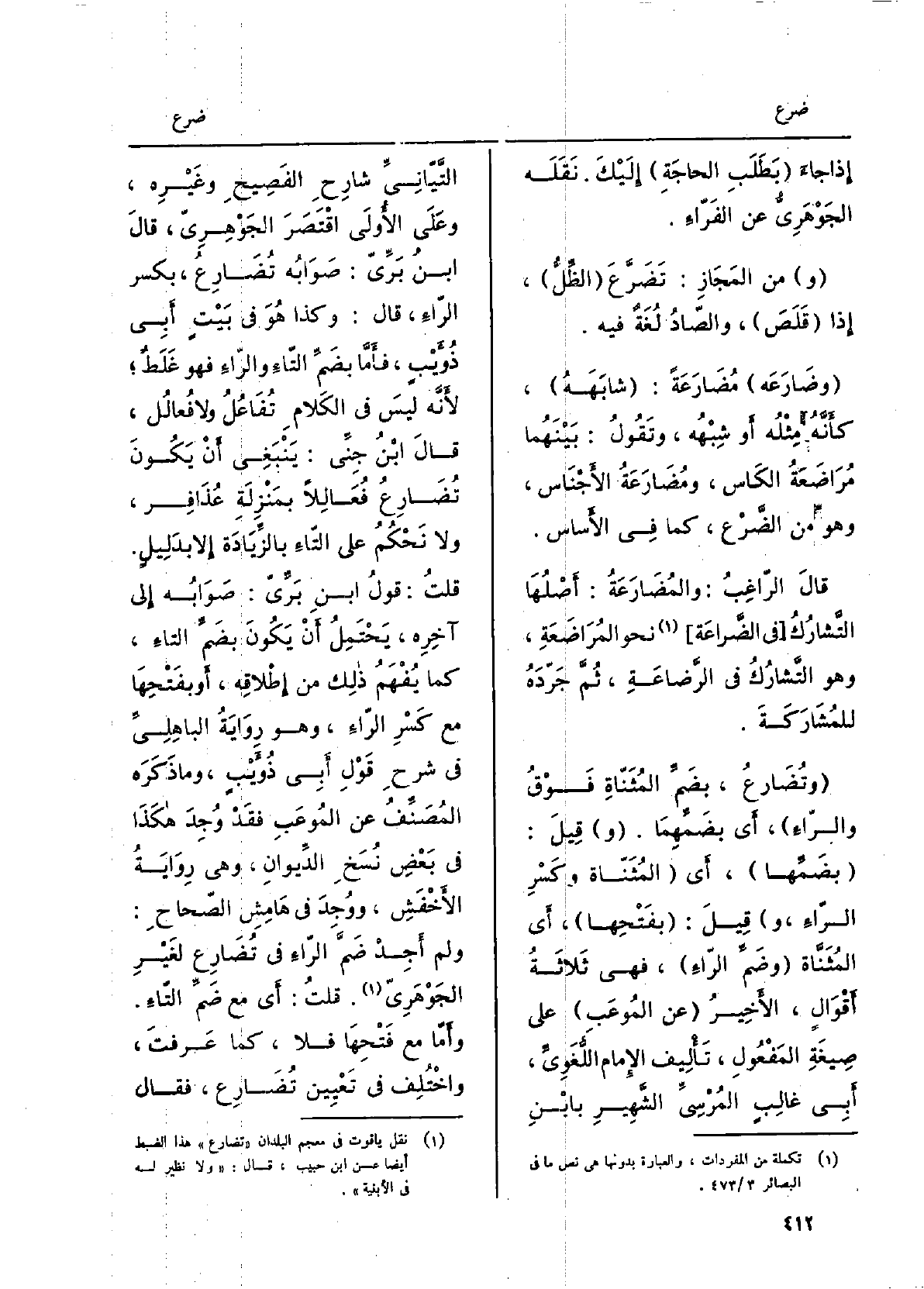 وضارَعَهُ مُضارَعَةً: شابهَهُ، كأَنَّه مثلُه أَو شِبهُه، وَتقول: بينَهُما مُراضَعَةُ الكاسِ، ومَضارَعَةُ الأَجناس، وَهُوَ من الضَّرْعِ، كَمَا فِي الأَساس. قَالَ الرَّاغِبُ: والمُضارَعَةُ: أَصلُها التَّشارُكُ فِي الضَّرَاعَةِ، ثمَّ جرَّدَه للمُشارَكَةْ. وتضَارعُ، بضَمِّ المُثَنَّاةِ فوقُ والرَّاءِ، أَي بضَمِّهما. قيل: بضَمِّها، أَي المُثَنّاة وكَسر الرَّاءِ، فَهِيَ ثلاثةُ أَقوالٍ، الأَخيرُ عَن المُوعَبِ، على صِيغَة لمَفعول، تأْليف الإِمَام اللُّغَوِيِّ أَبلي غالبٍ المُرْسِيِّ الشَّهيرِ بابنِ التَّيانِيِّ شارِحِ الفصيحِ وغيرِه، وعَلى الأُولَى اقتصَرَ الجَوْهَرِيّ، قَالَ ابنُ برّيّ: صوابُه تُضارِعُ، بكسْر الرَّاءِ، قَالَ: وَكَذَا هُوَ فِي بَيت أَبي) ذُؤَيْب، فأَمّا بضَمِّ التّاءِ والرّاءِ فَهُوَ غَلَطٌ، لأَنَّه ليسَ فِي الكلامِ تَفاعُلُ وَلَا فُعالُلُ، قَالَ ابْن جنّيّ: يَنبغي أَن يكون تُضارِعُ فُعالِلاً بمَنزلَة عُذافِر، وَلَا نحكُم على التّاء بالزِّيادَةِ إلاّ بدَليلٍ. قلتُ: قولُ ابْن برّيّ: صَوابُه إِلَى آخِرِه، يَحتَمِلُ أَنْ يَكونَ بضَمِّ التّاءِ، كَمَا يُفهَمُ ذلكَ من إطلاقِه، أَو بفتحِها مَعَ كَسْرِ الرَّاءِ، وَهُوَ رِوَايَة الباهِليِّ فِي شرحِ قولِ أَبي ذُؤَيبٍ، وَمَا ذكَرَه المُصنِّفُ عَن المُوعَبِ فقد وُجِدَ هَكَذَا فِي بعضِ نُسَخِ الدِّيوانِ، وَهِي روايَةُ الأَخفَشِ، ووُجِدَ فِي هامِشِ الصِّحاحِ: ولمْ أَجِدْ ضَمَّ الرَّاءِ فِي تُضارِع لغيرِ الجوهَرِيّ. قلتُ: أَي مَعَ ضَمِّ التّاءِ، وأَمّا مَعَ فَتحِها فَلَا، كَمَا عرفتَ، واخْتُلِفَ فِي تعْيين تُضارِع، فَقَالَ