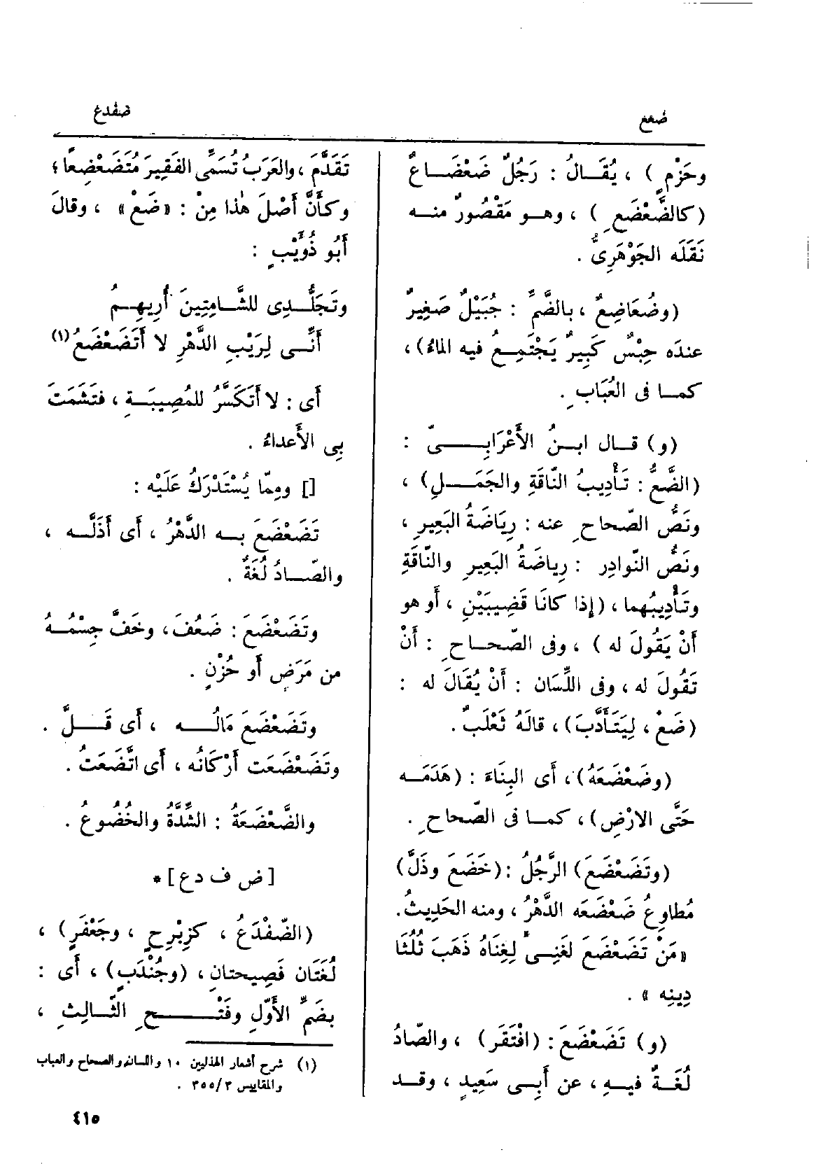 وحَزمٍ، يُقَال: رجلٌ ضَعْضَاعٌ كالضَّعْضَع، وَهُوَ مقصورٌ مِنْهُ نَقَلَه الجَوْهَرِيّ. وضُعاضِعٌ، بالضَّمّ: جُبَيْلٌ صغيرٌ عِنْده حِبْسٌ كبيرٌ يَجْتَمِعُ فِيهِ الماءُ، كَمَا فِي العُباب. قَالَ ابْن الأَعْرابِيّ: الضَّعُّ: تَأْدِيبُ الناقةِ والجمَل، ونصُّ الصِّحَاح عَنهُ: رِياضَةُ البَعيرِ، ونصُّ النَّوَادِر: رِياضَةُ البعيرِ والناقةِ وتأديبُهما، إِذا كَانَا قَضيبَيْنِ، أَو هُوَ أَن يَقُول لَهُ، وَفِي الصِّحَاح: أَن تقولَ لَهُ، وَفِي اللِّسان: أَن يُقَال لَهُ: ضَعْ، ليَتَأَدَّب، قَالَه ثعلبٌ. وضَعْضَعه، أَي البناءَ: هَدَمَه حَتَّى الأرضِ، كَمَا فِي الصِّحَاح. وتَضَعْضعَ الرجلُ: خَضَعَ وذَلَّ مُطاوِعُ ضَعْضَعَه الدهرُ، وَمِنْه الحديثُ: مَن تَضَعْضَعَ لغَنِيٍّ لغِناهِ ذَهَبَ ثُلُثا دِينِه. تَضَعْضعَ: افْتقرَ، والصادُ لغةٌ فِيهِ، عَن أبي سعيدٍ، وَقد تقدّم، والعربُ تُسمِّي الفقيرَ مُتَضَعْضِعاً وكأنَّ أصلَ هَذَا من: ضَعْ، وَقَالَ أَبُو ذُؤَيْبٍ: