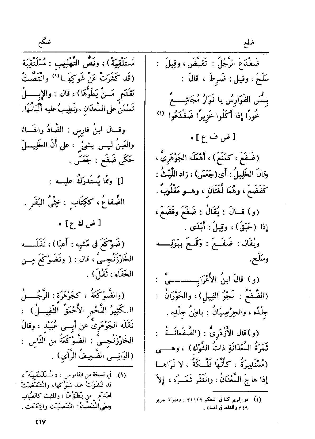 ضَفَعَ، كَمَنَع، أهمله الجَوْهَرِيّ، وَقَالَ الخليلُ: أَي جَعَسَ، زَاد الليثُ: كَفَضَعَ، وهما لُغَتَانِ، وَهُوَ مَقْلُوبٌ. قَالَ: يُقَال: ضَفَعَ وفَضَعَ، إِذا حَبَقَ، وَقيل: أَبْدَى. وَيُقَال: ضَفَعَ: وَقَعَ ببَولِه وسَلَحَ. قَالَ ابْن الأَعْرابِيّ: الضَّفْعُ، نَجْوُ الفيلِ، والحَوْران: جِلدُه، والحِرْصِيَان: باطِنُ جِلدِه. قَالَ الأَزْهَرِيّ: الضَّفْعانَة: ثَمَرَةُ السَّعْدانةِ ذاتُ الشوكِ، وَهِي مُستَديرَةٌ، كأنّها فَلْكَةٌ، لَا ترَاهَا إِذا هاجَ السَّعْدانُ، وانْتَثرَ ثمرُه، إلاّ مُستَلقِيَةً، ونَصُّ التهذيبِ: مُسْلَنْقِيَة قد كَشَرَتْ عَن شَوْكِها وانْتَصَّتْ لقَدَمِ مَن يطَؤُها، قَالَ: والإبلُ تَسْمَنُ على السَّعْدانِ، وتَطيبُ عَلَيْهِ ألبانُها. وَقَالَ ابنُ فارِسٍ: الضادُ والفاءُ والعَينُ لَيْسَ بشيءٍ، على أنّ الخليلَ حكى ضَفَعَ: جَعَسَ. ومِمّا يُسْتَدْرَك عَلَيْهِ: الضِّفَاع، ككِتابٍ: خِثْيُ البَقَرِ.
