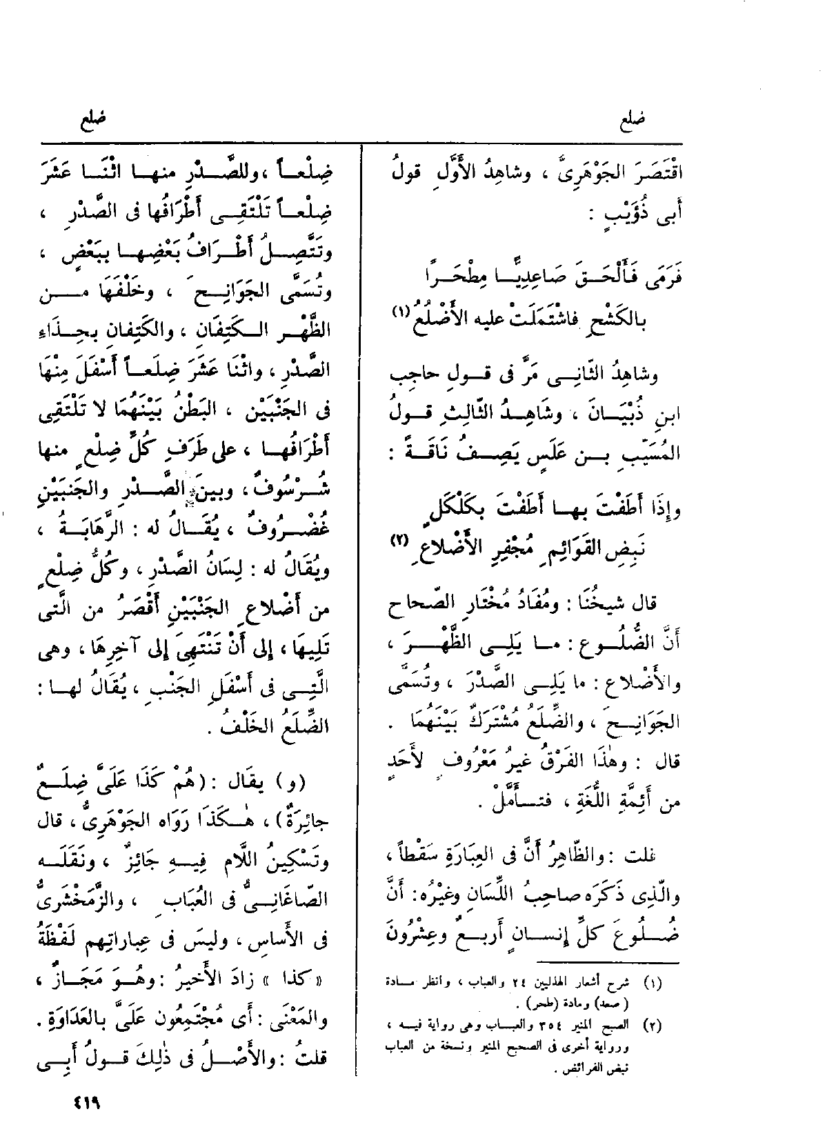 قَالَ شيخُنا: ومُفادُ مُختارِ الصحاحِ أنّ الضُّلوع: مَا يَلِي الظَّهْرَ، والأضلاع: مَا يَلِي الصَّدْرَ، وتُسمّى الجَوانِح، والضِّلَعُ مُشتَركٌ بَينهمَا. قَالَ: وَهَذَا الفرقُ غيرُ معروفٍ لأحدٍ من أئمّةِ اللُّغَة، فَتَأَمَّلْ. قلت: والظاهرُ أَن فِي العبارةِ سَقْطَاً، وَالَّذِي ذَكَرَه صاحبُ اللِّسان وغيرُه: أنّ ضُلوعَ كلِّ إنسانٍ أَرْبَعٌ وعِشْرونَ ضِلْعاً، وللصدرِ مِنْهَا اثْنا عَشَرَ ضِلْعاً تَلْتَقي أَطْرَافُها فِي الصدرِ، وتتَّصِلُ أَطْرَافُ بَعْضِها ببعضٍ، وتُسمّى الجَوانِح، وَخَلْفها من الظهرِ الكَتِفانِ، والكتفانِ بحِذاءِ الصدرِ، واثْنا عَشَرَ ضِلَعاً أسفلَ مِنْهَا فِي الجَنبَيْن، البَطنُ بَينهمَا لَا تَلْتَقي أَطْرَافُها، على طرَفِ كلِّ ضِلْعٍ مِنْهَا شُرْسوفٌ، وَبَين الصدرِ والجَنبَيْنِ غُضْروفٌ، يُقَال لَهُ: الرَّهَابَة، وَيُقَال لَهُ: لسانُ الصَّدْر،)