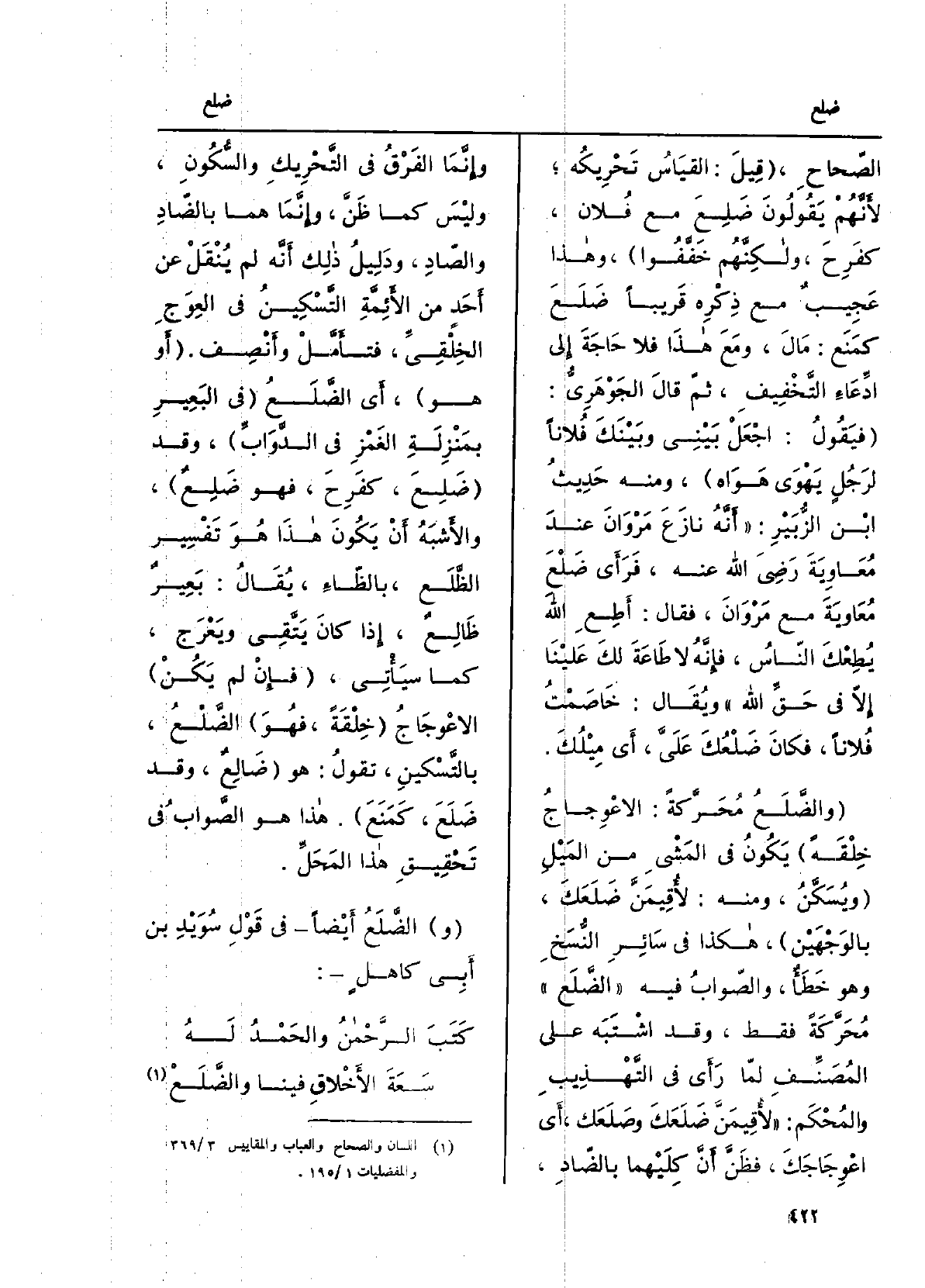 الصِّحَاح، قيل: القياسُ تحريكُه لأنّهم يَقُولُونَ ضَلِعَ مَعَ فلانٍ، كفَرِحَ، ولكنّهم خَفَّفوا، وَهَذَا عجيبٌ مَعَ ذِكرِه قَرِيبا ضَلَعَ كَمَنَع: مالَ، وَمَعَ هَذَا فَلَا حاجةَ إِلَى ادِّعاءِ التخفيفِ، ثمَّ قَالَ الجَوْهَرِيّ: فَيَقُول: اجْعلْ بيني وبينَك فلَانا لرجلٍ يَهْوَى هَواه، وَمِنْه حديثُ ابنِ الزُّبَيْر: أنّه نازَعَ مَرْوَانَ عندَ مُعاوِيَةَ رَضِيَ الله عَنهُ، فَرَأى ضَلْعَ مُعاويةَ مَعَ مَرْوَانَ، فَقَالَ: أَطِعِ اللهَ يُطِعْكَ الناسُ، فإنّه لَا طاعةَ لكَ علينا إلاّ فِي حقِّ الله. وَيُقَال: خاصَمْتُ فلَانا، فكانَ ضَلْعُكَ عليَّ، أَي مَيْلُك.