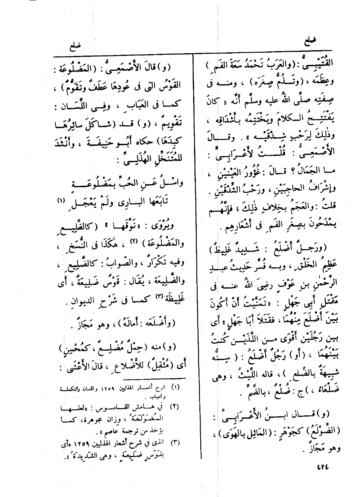 القُتَيْبيُّ: والعربُ تَحْمَدُ سَعَةَ الفمِ، وعِظَمَه، وتَذُمُّ صِغَرَه، وَمِنْه فِي صفتِه صلّى الله عَلَيْهِ وسلَّم أنّه: كَانَ يَفْتَتِحُ الكلامَ ويَخْتَتِمُه بأَشْداقِه، وَذَلِكَ لرَحْبِ شِدْقَيْه. وَقَالَ الأَصْمَعِيّ: قلتُ لأعرابيٍّ: مَا الجَمَال قَالَ: غُؤورُ العينَيْن، وإشرافُ الحاجِبَيْن، ورَحْبُ الشِّدْقَيْن. قلت: والعجَمُ بخِلافِ ذَلِك فإنّهم يَمْدَحونَ بصِغَرِ الفَمِ فِي أشعارِهم. ورجلٌ أَضْلَعُ: شديدٌ غليظٌ عظيمُ الخَلقِ، وَبِه فُسِّر حديثُ عبدِ الرحمنِ بنِ عَوْفٍ رَضِيَ اللهُ عَنهُ فِي مَقْتَلِ أبي جهلٍ: تمَنَّيْتُ أَن أكونَ بينَ أَضْلَعَ مِنْهُمَا، فَقَتَلا أَبَا جهلٍ.