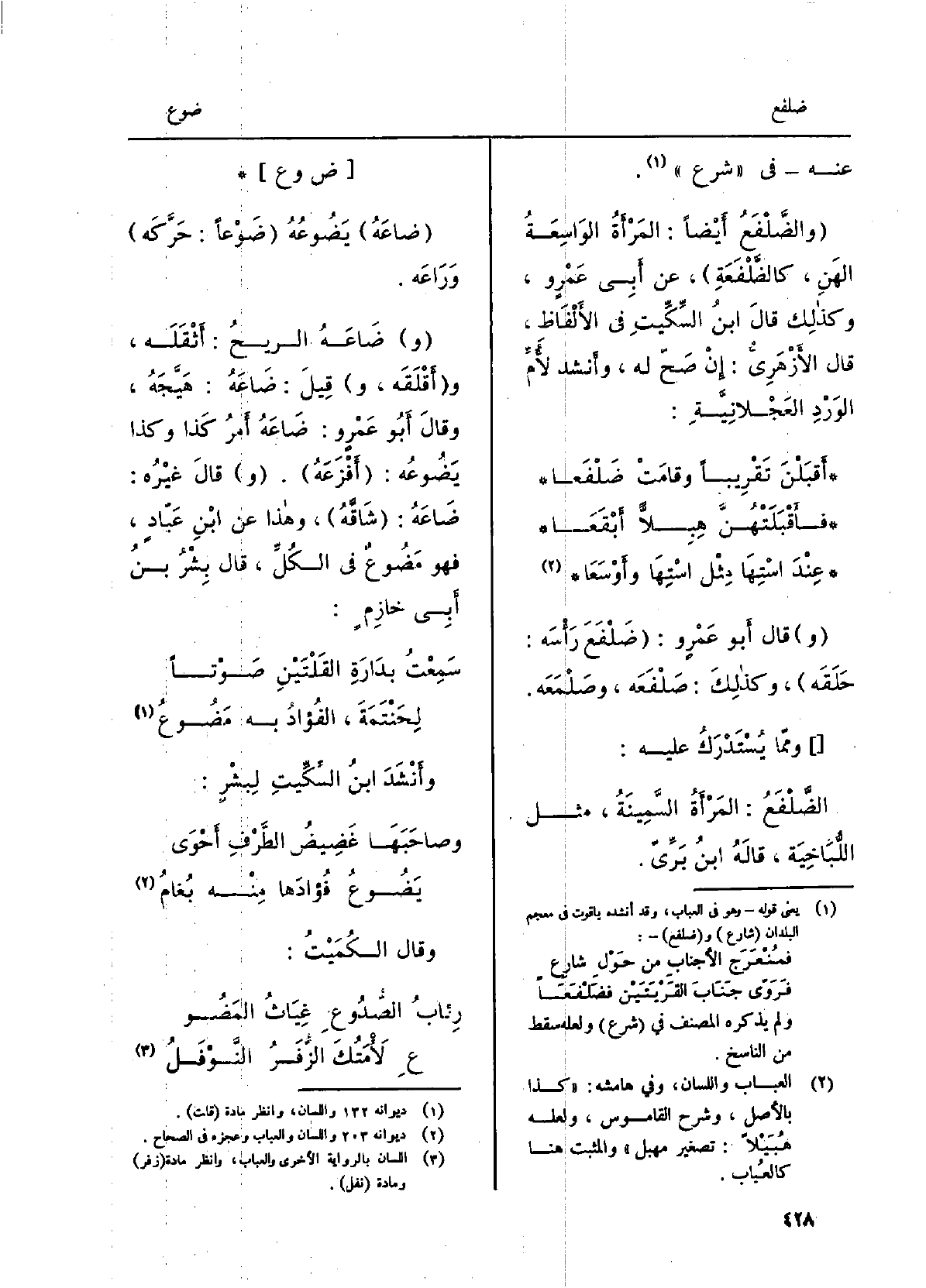 عندَ اسْتِها مِثلَ اسْتِها وأَوْسَعا قَالَ أَبُو عمروٍ: ضَلْفَعَ رَأْسَه: حَلَقَه، وَكَذَلِكَ: صَلْفَعه، وصَلْمَعه. ومِمّا يُسْتَدْرَك عَلَيْهِ: الضَّلْفَع: المرأةُ السَّمينةُ، مثل اللُّباخِيَة، قَالَه ابنُ بَرِّيّ.