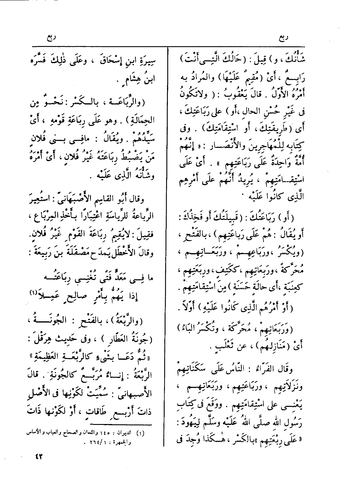 الأَوَّلُ. قَالَ يَعْقُوب: وَلَا تكونُ فِي غير حُسْنِ الحالِ، أَو على رَباعَتِكَ، أَي طريقَتِكَ، أَو اسْتِقامَتِكَ. وَفِي كِتَابه للمهاجِرينَ والأَنصار: إنَّهم أُمَّةٌ واحِدَةٌ على رَباعَتِهِم، أَي على اسْتِقامَتهم، يريدُ أَنَّهم على أَمرهِم الَّذِي كَانُوا عَلَيْهِ. رَباعَتُكَ: قبيلَتُكَ أَو فَخِذُكَ، أَو يُقَال: هُمْ على رَباعَتِهم، بِالْفَتْح، ويُكْسَرُ، ورَباعِهِم، ورَبَعاتِهم، محرَّكَةً، ورَبِعاتِهم، ككَتِفٍ، ورَبِعَتِهِمْ، كعِنَبَةٍ، أَي حالةٍ حَسَنةٍ من اسْتِقامَتِهمْ. أَو أَمْرُهُم الَّذِي كَانُوا عَلَيْهِ أَوّلاً، ورَبَعاتِهِمْ، مُحَرَّكَة، وتُكسَر الْبَاء أَي منازِلُهُم، عَن ثَعْلَبٍ. وَقَالَ الفرَّاءُ: النّاسُ على سكَناتِهم ونَزَلاتِهم، ورَباعَتِهم، ورَبَعاتِهم، يَعْنِي على اسْتِقامَتِهِم. ووَقَعَ فِي كتابِ رَسُول الله صلّى الله عَلَيْهِ وسلَّم لِيَهُودَ: على رِبْعَتِهِمْ بالكَسْر، هَكَذَا وُجِدَ فِي سيرة ابْن إسحاقَ، وعَلى ذلكَ فَسَّرَه ابنُ هشامٍ. والرِّباعة، بالكَسر: نَحوٌ من الحِمالَةِ. وَهُوَ على رِباعَةِ قومِه، أَي سيِّدُهم. ويقالُ: مَا فِي بني فُلانٍ مَنْ يَضْبطُ رِباعَتَهُ غيرُ فلانٍ، أَي أَمْرَهُ وشأْنَهُ الَّذِي عَلَيْهِ. وَقَالَ أَبو الْقَاسِم الأَصبهانِيّ: استُعيرَ الرِّباعةُ للرِّياسَةِ اعْتِبَارا بأَخْذِ المِرْباع، فَقيل: لَا يُقيمُ رِباعَةَ القَوْمِ غيرُ فلانٍ. وَقَالَ الأَخطل يَمدَح مَصْقَلَةَ بنَ رَبيعَةَ: