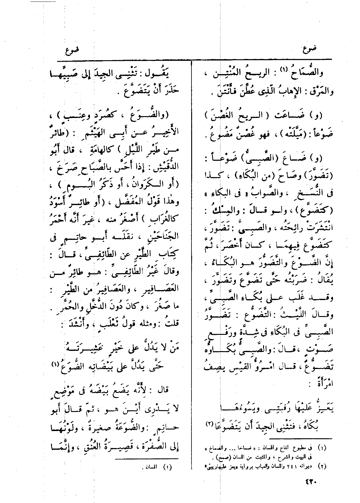 يَقُول: تَثني الجِيدَ إِلَى صَبِيِّها حذَرَ أَن يَتَضَوَّعً.} والضُّوَعُ، كصُرَدٍ وعِنَبٍ، الأَخيرُ عَن أَبي الهَيثَمِ: طائرٌ من طير الليلِ كالهامَةِ، قَالَ أَبو الدُّقَيْشِ: إِذا أَحَسَّ بالصَّباحِ صَرَخَ، أَو الكَرَوانُ، أَو ذَكَرُ البومِ، وَهَذَا قولُ المُفَضَّل، أَو طائرٌ أَسودُ كالغُرابِ أَصغَرُ مِنْهُ، غير أَنَّه أَحمَرُ الجَناحَينِ، نَقله أَبو حاتمٍ فِي كتاب الطَّيرِ عَن الطَّائفِيِّ، قَالَ: وَقَالَ غيرُ الطَّائفِيِّ: هُوَ طائرٌ من العصافيرِ، والعصافيرُ من الطَّيرِ: مَا صَغُرَ، وكانَ دونَ الدُّخَّلِ والحُمَّرِ. قلت: ومثلُه قولُ ثعلَبٍ، وأَنشدَ:
