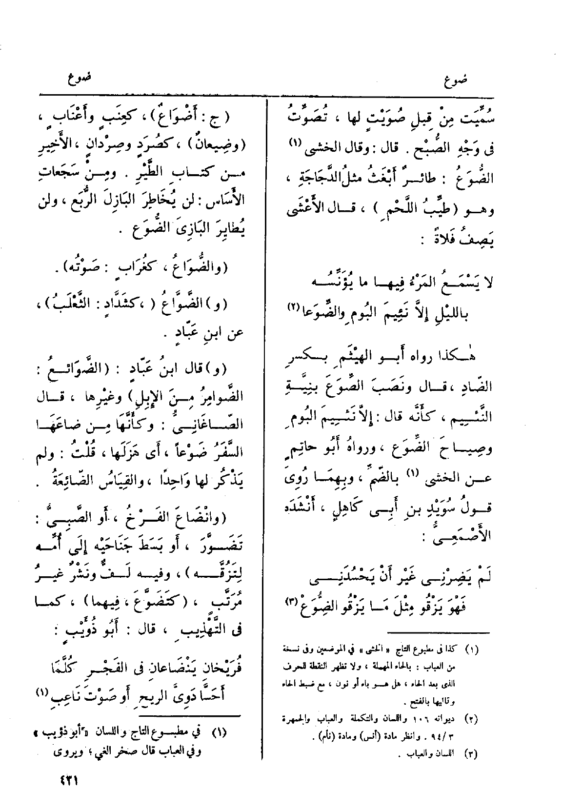 هَكَذَا رواهُ أَبو الهيثمِ بكَسْرِ الضَّادِ، قَالَ: ونَصَبَ الصِّوَعَ بنِيَّةِ النَّئيمِ، كأَنَّه قَالَ: إلاّ نَئيمَ البومِ وصِياحَ} الضِّوَع، وَرَوَاهُ أَبو حاتمٍ عَن الخشى بالضَّمِّ، وَبِهِمَا رويَ قولُ سُوَيْدِ بنِ أَبي كاهِلٍ، أَنشدَه الأَصمعِيُّ: