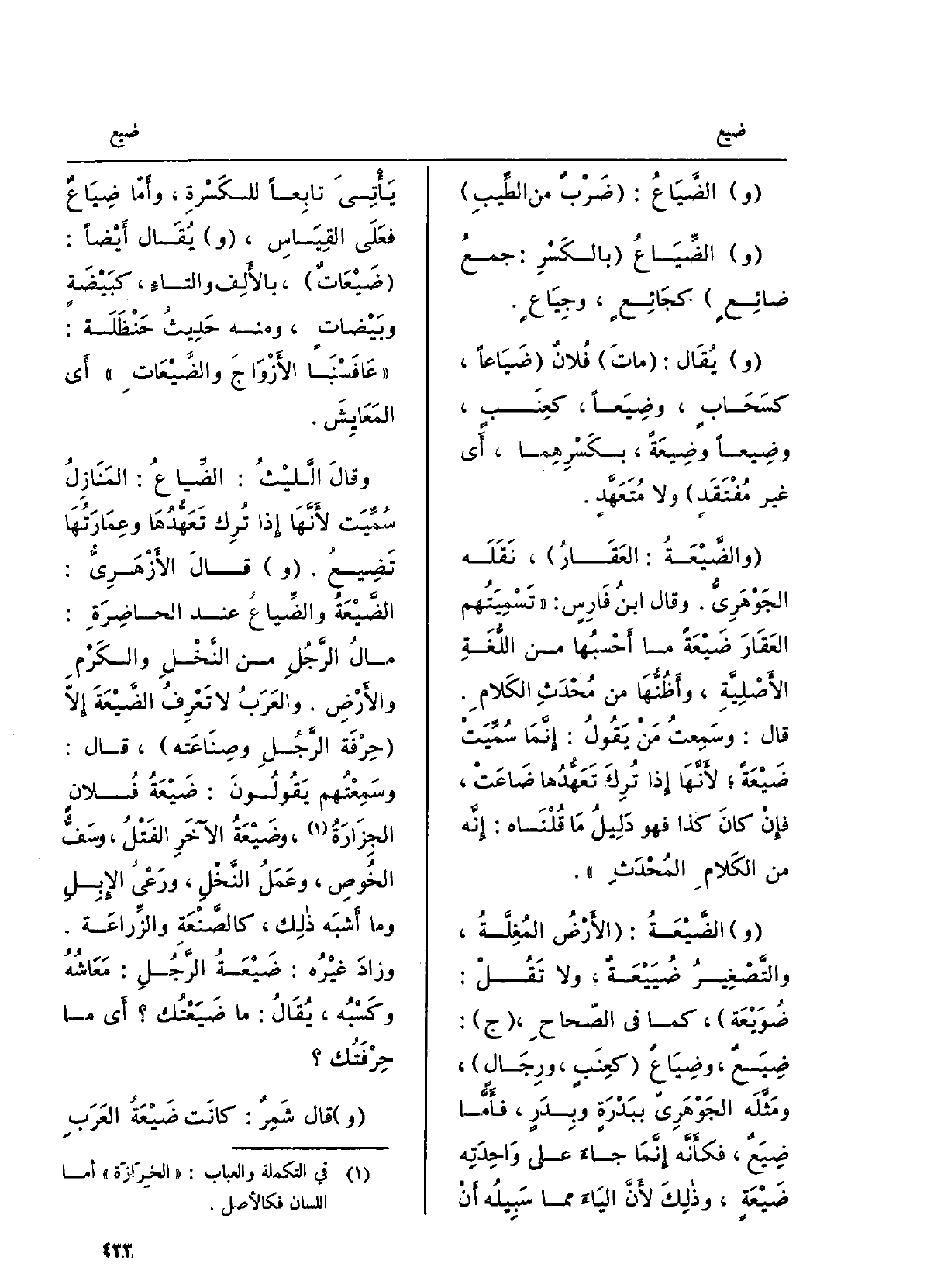 الضَّياعُ: ضَرْبٌ من الطِّيبِ. (و) {الضِّياعُ، بالكَسر: جَمعُ} ضائعٍ، كجائعٍ، وجِياعٍ. يُقَال: مَاتَ فلانٌ ضَياعاً، كسَحابٍ، {وضِيَعاً، كعِنَبٍ،} وضِيَعاً {وضِيَعَةً، بكسرِهما، أَي غيرَ مُفْتَقَدٍ وَلَا مُتَعَهَّدٍ.} والضَّيْعَةُ: العَقارُ، نَقله الجَوْهَرِيّ. وَقَالَ ابنُ فارسٍ: تَسمِيَتُهُمُ العقارَ ضَيعَةً مَا أَحسَبُها من اللُّغَةِ الأَصلِيَّةِ، وأَظُنُّها من مُحدَثِ الْكَلَام. قَالَ: وسمعتُ مَن يَقول: إنَّما سُمِّيَت ضَيْعَةً، لأَنَّها إِذا تُرِكَ تَعَهُّدُها ضاعَتْ، فَإِن كَانَ كَذَا فَهُوَ دليلُ مَا قُلناه: إنَّه من الْكَلَام المُحْدَثِ. الضَّيْعَةُ: الأَرْضُ المُغِلَّةُ، والتَّصغيرُ {ضُيَيْعَةٌ، وَلَا تَقُلْ: ضُوَيْعَة، كَمَا فِي الصِّحاح، ج:} ضِيَعٌ، {وضِياعٌ كعِنَبٍ ورِجالٍ، ومَثَّلَه الجَوْهَرِيّ ببَدْرَةٍ وبِدَرٍ، فأمّا ضِيَعٌ، فكأَنَّه إنَّما جاءَ على واحدته ضَيعَةٍ، وَذَلِكَ لأَنَّ الياءَ مِمَّا سبيلُه أَنْ يَأْتِيَ تَابعا للكَسْرَةِ، وأَمّا ضِياعٌ فعلى القِياسِ، يُقال أَيضاً:} ضَيْعاتٌ، بالأَلِفِ والتّاءِ، كبَيضَةٍ وبَيْضاتٍ، وَمِنْه حديثُ حنظَلَة: عافَسْنا الأَزواجَ {والضَّيْعاتِ، أَي المَعايِشَ. وَقَالَ الليثُ: الضِّياعُ: المَنازِلُ سُمِّيَتْ لأَنَّها إِذا تُرِكَ تَعَهُّدُها وعِمارَتُها} تَضيعُ. قَالَ الأَزْهَرِيّ: {الضَّيعَةُ} والضِّياعُ عندَ الحاضِرَةِ: مالُ الرَّجُلِ من النَّخْلِ والكَرْمِ والأَرضِ. والعربُ لَا تَعرِفُ الضَّيعَةَ إلاّ حِرفَةَ الرجلِ وصِناعَتَه، قَالَ: وسمعتُهم يَقولونَ: ضَيعَةُ فُلانٍ الجِزارَةُ، وضيعَةُ الآخَرِ الفَتْلُ، وسَفُّ الخُوصِ، وعَمَلُ النَّخْلِ، ورَعْيُ الإبِلِ وَمَا أَشبهَ ذَلِك، كالصَّنعَةِ والزِّراعَةِ. وزادَ غيرُه: ضَيعَةُ الرَّجُلِ: مَعاشُهُ وكَسْبُه، يُقال: مَا! ضَيْعَتُكَ أَي مَا حِرْفَتُكَ قَالَ شَمِرٌ: كَانَت ضَيعَةُ العَرَبِ
