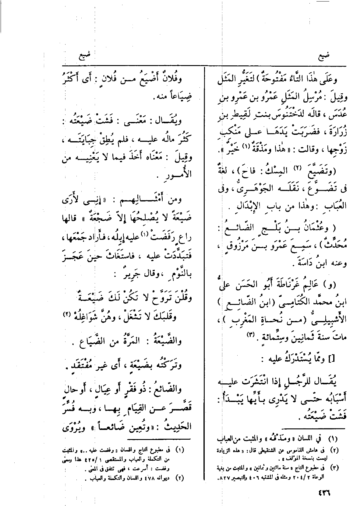 وعثمانُ بنُ بَلْجٍ الضّائعُ: مُحَدِّثٌ، سمعَ عَمرو بنَ مَرزوقٍ، وَعنهُ ابنُ داسَةَ. عالِمُ غَرناطَةَ أَبو الحسَن عليُّ بنُ محمَّد الكُتامِيّ ابنُ} الضائع الأَشبيليُّ، من نُحاةِ المَغرِبِ، مَاتَ سنةَ ثمانينَ وستِّمائة. وممّا يُستدركُ عَلَيْهِ: يُقال للرَّجُلِ إِذا انتشرَتْ عَلَيْهِ أَسبابُه حتّى لَا يَدري بأَيِّها يبدأُ: فَشَتْ ضَيْعَتُه. وفُلانٌ {أَضيَعُ من فلانٍ: أَي أَكثر} ضِياعاً مِنْهُ. ويُقال: مَعنى: فَشَتْ {ضَيعتُه: كَثُرَ مالُ عَلَيْهِ، فَلم يطِق جِبايَتَهُ، وَقيل: مَعْنَاهُ أّخَذَ فِيمَا لَا يَعنيه من الأُمور. وَمن أَمثالِهم: إنِّي لأَرى} ضَيعَةً لَا يُصلِحُها إلاّ ضَجْعَةٌ، قَالَهَا راعٍ رَفَضَتْ عَلَيْهِ إبلُهُ، فأَرادَ جَمعَها، فتَبَدَّدَت عَلَيْهِ، فاستغاثَ حينَ عجز بالنَّومِ، وَقَالَ جَريرٌ: