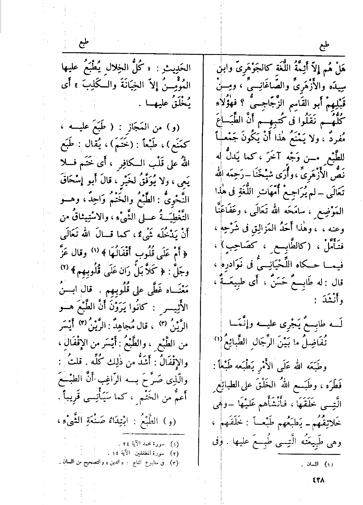 وطَبَعَه اللهُ على الأَمر يطْبَعه طَبعاً: فطَرَه، وطَبَعَ الله الخَلقَ على الطَّبائع الّتي خلَقَها، فأَنشأَهُم عَلَيْهَا، وَهِي خَلائقُهُم، يَطبَعُهم طَبعاً: خَلَقَهم، وَهِي طَبِيعَته الَّتِي طُبِعَ عَلَيْهَا. وَفِي الحَديثِ: كُلُّ الخِلالِ يُطْبَعُ عَلَيْهَا المُؤْمِنُ إلاّ الخِيانَةَ والكَذِبَ، أَي يُخلَقُ عَلَيْهَا. منَ المَجاز: طَبَعَ عَلَيْهِ، كمَنَع، طَبعاً: خَتَمَ، يُقَال: طَبَعَ اللهُ على قلبِ الكافِرِ، أَي خَتَمَ فَلَا يَعي، وَلَا يُوَفَّقُ لِخَيْرٍ، قَالَ أَبو إسحاقَ النَّحْوِيُّ: الطَّبْعُ والخَتْمُ واحِدٌ، وَهُوَ التَّغطِيَةُ على الشيءِ، والاستيثاقُ مِن أَن يَدخُلَهُ شيءٌ، كَمَا قَالَ الله تَعَالَى: أَمْ على قُلوبٍ أَقفالُها، وَقَالَ عزَّ وجَلَّ: كَلاّ بلْ رانَ على قُلوبِهِمْ) مَعناهُ غَطَّى على قُلوبِهِم، قَالَ ابنُ الأَثيرِ: كَانُوا يَرَوْنَ أَنَّ الطَّبْعَ هُوَ الرَّيْنُ، قَالَ مُجاهِدٌ: الرَّيْنُ أَيسر من الطَّبع، والطَّبعُ أَيسرُ من الإقفالِ، والإقفال: أَشَدُّ من ذلكَ كُلِّه، قلتُ: والّذي صَرَّحَ بِهِ الرَّاغِبُ أَنَّ الطَّبْعَ أَعَمُّ من الخَتْمِ، كَمَا سَيَأْتِي قَرِيبا. الطَّبْعُ: ابتداءُ صَنعَةِ الشيءِ،