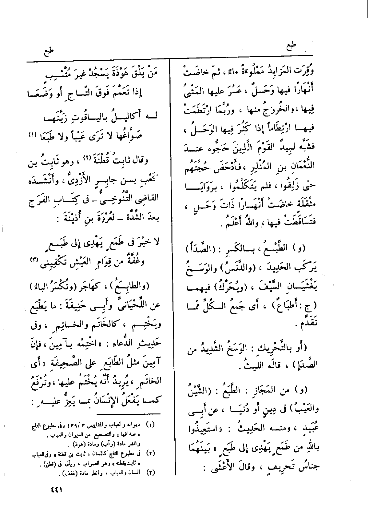 وُقِرَت المَزايدُ مَمْلُوءَةً ناءً، ثمّ خاضتْ أَنهَارًا فِيهَا وَحَلٌ، عَسُرَ عَلَيْهَا المَشيُ فِيهَا، والخروجُ مِنْهَا، وَرُبمَا ارتَطمَتْ فِيهَا ارْتِطاماً إِذا كَثُرَ فِيهَا الوحَلُ، فشَبَّه لبيدٌ القومَ الَّذين حاجُّوه عِنْد النعمانِ بنِ المُنذِر، فَأَدْحَضَ حُجَّتَهم حَتَّى زَلِقوا، فَلم يتكلَّموا، بروايا مثْقَلةٍ خاضتْ أَنْهَاراً ذاتَ وَحَلٍ، فتساقَطَتْ فِيهَا، واللهُ أعلم. الطِّبْع، بالكَسْر: الصدَأُ يركبُ الحَديد، والدَّنَسُ والوسَخُ يَغْشَيان السيفَ، ويُحرَّكُ فيهمَا ج: أَطْبَاعٌ، أَي جَمْعُ الكلِّ ممّا تقدّم. أَو بِالتَّحْرِيكِ: الوسَخُ الشديدُ من الصدَإ، قَالَه اللَّيْث. منَ المَجاز: الطَّبَع: الشَّيْنُ والعَيبُ فِي دِينٍ أَو دنيا، عَن أبي عُبَيْدٍ، وَمِنْه الحَدِيث: اسَتعيذوا باللهِ من طَمَعٍ يهدي إِلَى طَبَعٍ بَينهمَا جناسُ تَحريفٍ، وَقَالَ الْأَعْشَى: