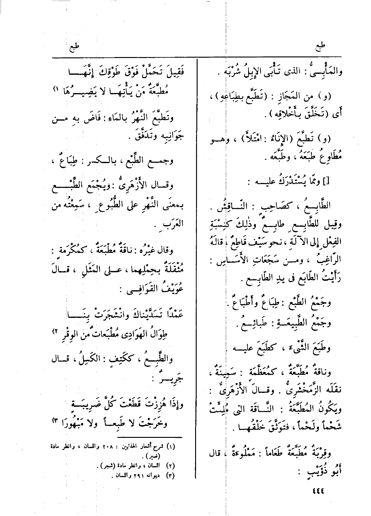 وجمعُ الطَّبْع: طِبَاعٌ وأَطْبَاعٌ. وجمعُ الطَّبيعَة: طَبائِع. وطَبَعَ الشيءَ، كَطَبَعَ عَلَيْهِ. وناقةٌ مُطَبَّعَةٌ، كمُعَظَّمةٍ: سَمينةٌ، نَقله الزَّمَخْشَرِيّ. وَقَالَ الأَزْهَرِيّ: وَيكون المُطَبَّعَةُ: النَّاقة الَّتِي مُلِئَت شَحْمَاً ولَحْمَاً، فَتَوَثَّقَ خَلْقُها. وقِربَةٌ مُطَبَّعةٌ طَعاماً: مَمْلُوءةٌ، قَالَ أَبُو ذُؤَيْبٍ: