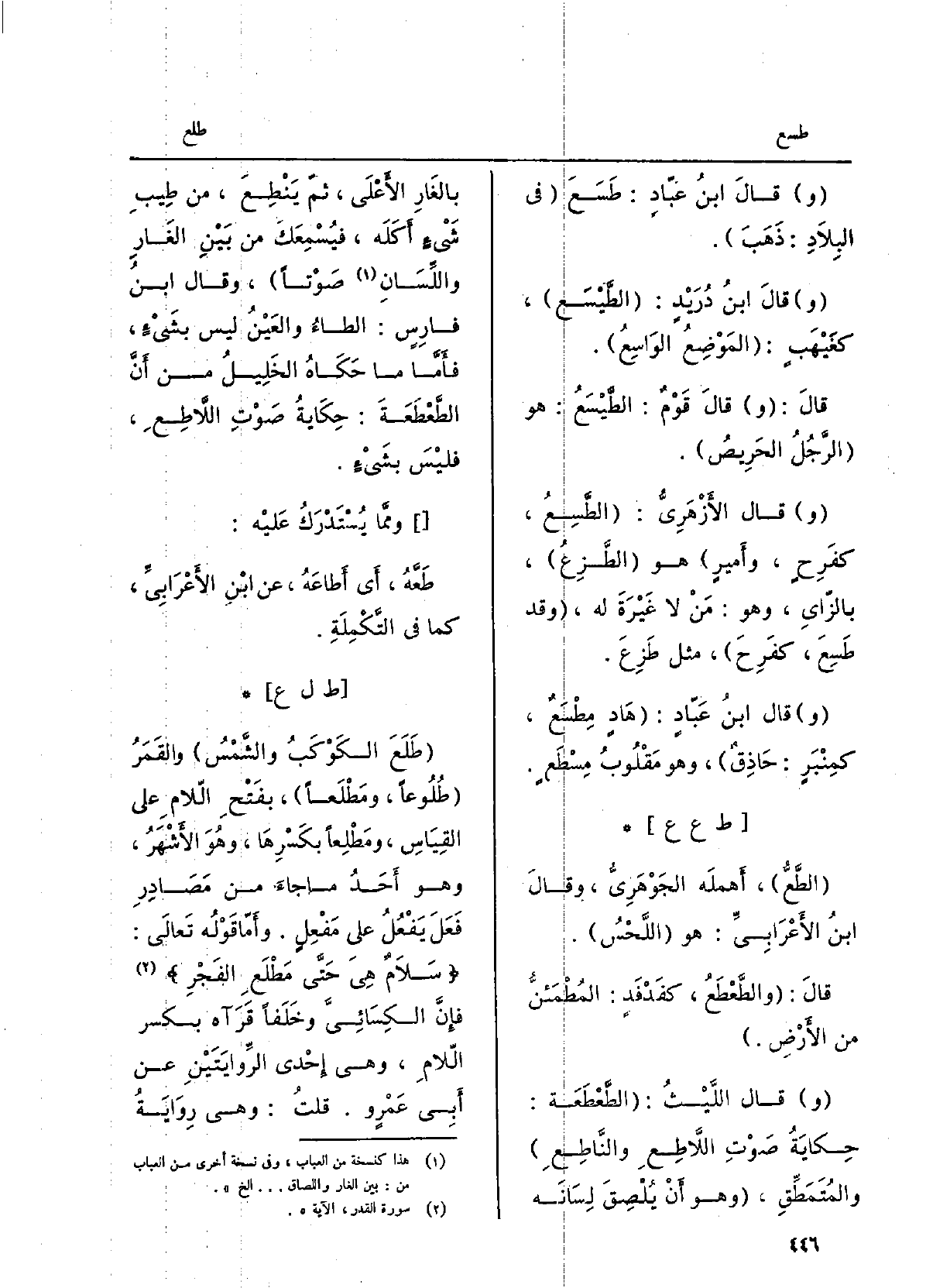 طَلَعَ الكَوْكَبُ والشمسُ والقمَرُ طُلوعاً، ومَطْلَعاً، بفتحِ اللامِ على القياسِ، ومَطْلِعاً بكسرِها، وَهُوَ الْأَشْهر، وَهُوَ أحد مَا جاءَ من مصادرِ فَعَلَ يَفْعُلُ على مَفْعِلٍ. وأمّا قَوْله تَعالى: سَلامٌ هِيَ حَتَّى مَطْلَعِ الفَجْرِ فإنّ الكِسائيَّ وَخَلَفاً قرآه بِكَسْر اللَّام، وَهِي إِحْدَى الرِّوايتَيْن عَن أبي عمروٍ. قلتُ: وَهِي روايةُ