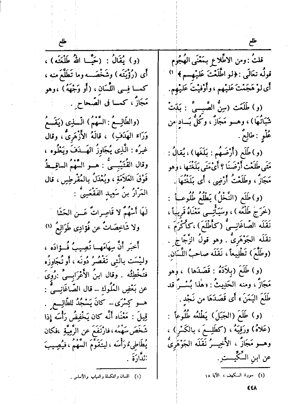 قلتُ: وَمن الاطِّلاعِ بِمَعْنى الهُجومِ قَوْله تَعالى: لَو اطَّلَعْتَ عَلَيْهِم أَي لَو هَجَمْتَ عَلَيْهِم، وأَوْفَيْتَ عَلَيْهِم. طَلَعَت سِنُّ الصبِيِّ: بَدَتْ شَبَاتُها، وَهُوَ مَجاز،)