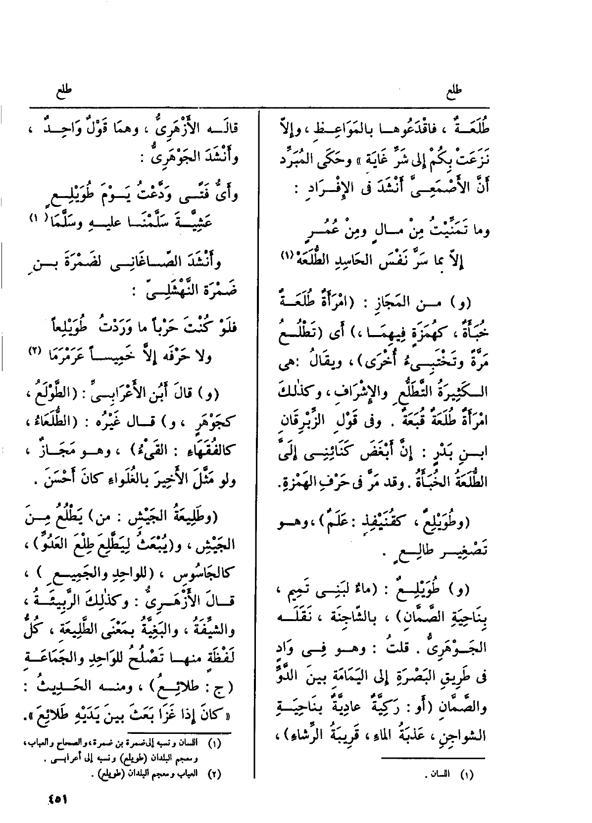 منَ المَجاز: امرأةٌ طُلَعَةٌ خُبَأَةٌ، كهُمَزةٍ فيهمَا، أَي تَطْلُعُ مرّةً وتَخْتَبِئُ أُخرى، وَيُقَال: هِيَ الكثيرةُ التَّطلُّعِ والإشرافِ، وَكَذَلِكَ امرأةٌ طُلَعةٌ قُبَعةٌ. وَفِي قولِ الزَّبْرَقانِ بنِ بدرٍ: إنّ أَبْغَضَ كَنائني إليَّ الطُّلَعةُ الخُبَأَة. وَقد مرَّ فِي حرفِ الْهمزَة. وطُوَيْلِعٌ، كقُنَيْفِذٍ: عَلَمٌ، وَهُوَ تصغيرُ طالِعٍ. طُوَيْلِعٌ: ماءٌ لبَني تَميم، بناحيةِ الصَّمَّان، بالشاجِنَة، نَقله الجَوْهَرِيّ، قلتُ: وَهُوَ فِي وادٍ فِي طريقِ البَصْرةِ إِلَى اليَمامةِ بَين الدَّوِّ والصَّمَّانِ أَو: رَكِيَّةٌ عادِيَّةٌ بناحيةِ الشواجِن، عَذْبَةُ الماءِ، قريبةُ)