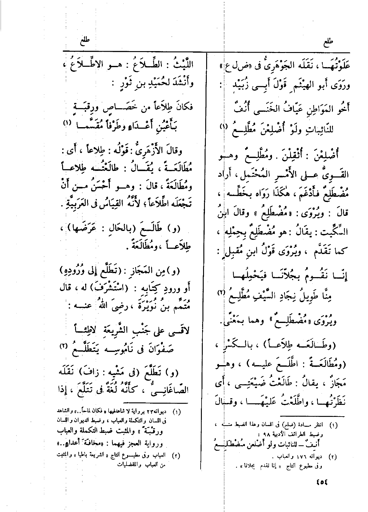 وَقَالَ الأَزْهَرِيّ: قولُه: طِلاعاً، أَي: مُطالَعةً، يُقَال: طالَعْتُه طِلاعاً ومُطالَعةً، قَالَ: وَهُوَ أحسنُ من أنْ تَجْعَله اطِّلاعاً لأنّه القياسُ فِي العربيَّة. طالَعَ بِالْحَال: عَرَضَها، طِلاعاً، ومُطالَعةً. منَ المَجاز: تطَلَّعَ إِلَى وُرودِه أَو ورودِ كِتابِه: اسْتَشرفَ لَهُ، قَالَ مُتَمِّم بن نُوَيْرةَ، رَضِيَ الله عَنهُ:)