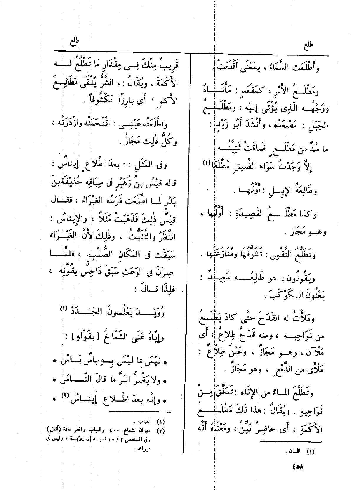 وطالِعَةُ الإبلِ: أوَّلُها. وَكَذَا مَطْلَعُ القَصيدةِ: أوَّلُها، وَهُوَ مَجاز. وتطَلُّعُ النَّفْسِ: تشَوُّفُها ومُنازَعَتُها. وَيَقُولُونَ: هُوَ طالِعُه سعيدٌ: يَعْنُونَ الكَوكبَ. وملأْتُ لَهُ القدَحَ حَتَّى كادَ يَطْلَعُ من نواحيه، وَمِنْه قدَحٌ طِلاعٌ، أَي مَلآن، وَهُوَ مَجاز، وعَينٌ طِلاَعٌ: مَلأى من الدمع، وَهُوَ مَجاز.