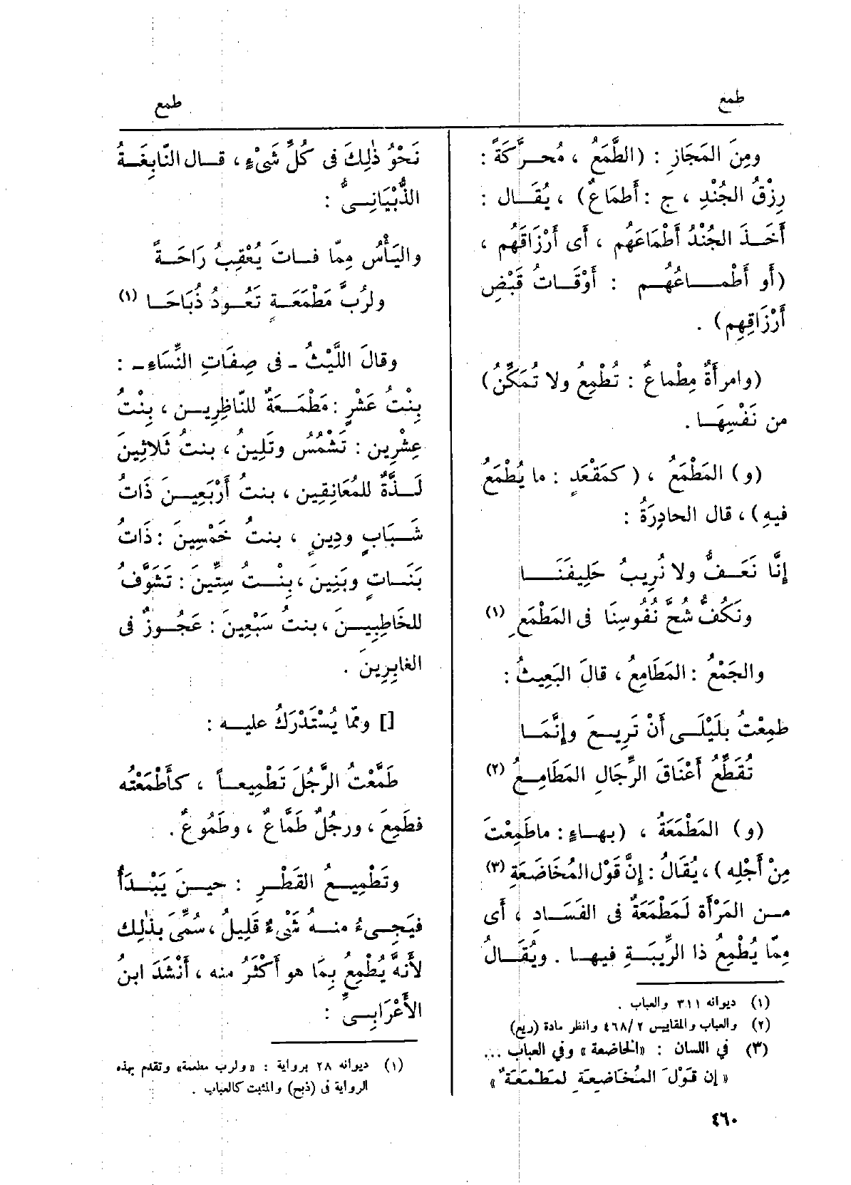 وَقَالَ الليثُ، فِي صِفَات النِّساءِ: بِنتُ عَشْرٍ: مَطْمَعَةٌ للنّاظِرينَ، بنتُ عِشرين: تَشْمُسُ وتَلينُ، بنتُ ثلاثينَ: لَذَّةٌ للمُعانِقين، بنتُ أَربعين: ذاتُ شَبابٍ وَدين، بنتُ خَمسينَ: ذاتُ بناتٍ وبَنينَ، بنتُ سِتِّينَ: تَشَوَّفُ للخاطِبينَ، بنتُ سَبعينَ: عَجوزٌ فِي الغابرينَ. وَمِمَّا يُستدرَكُ عَلَيْهِ: طَمَّعْتُ الرَّجُلَ تَطْمِيعاً، كأَطْمَعْتُه فطَمِعَ، ورجلٌ طَمّاعٌ، وطَموعٌ. وتَطميعُ القَطْرِ: حينَ يبدأُ فيجيءُ مِنْهُ شيءٌ قليلُ، سُمِّيَ بذلكَ لأَنَّه يُطْمِعُ بِمَا هُوَ أَكثر مِنْهُ، أَنشدَ ابْن الأَعرابيِّ: