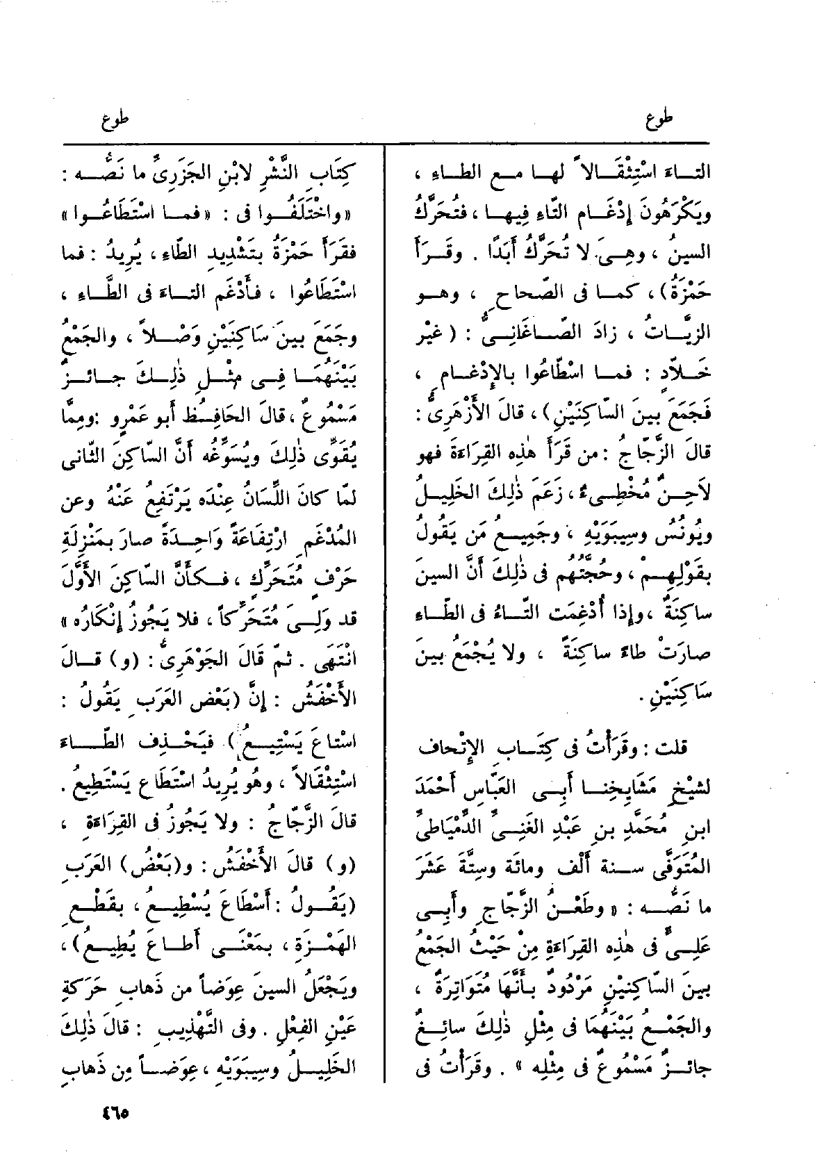 التّاءَ اسْتِثقالاً لَهَا مَعَ الطّاءِ، ويكرهونَ إدغامَ التّاءِ فِيهَا، فتُحَرَّكُ السِّينُ، وَهِي لَا تُحَرَّكُ أَبداً. وقرأَ حمزةُ، كَمَا فِي الصِّحَاح، وَهُوَ الزَّيّاتُ، زَاد الصَّاغانِيُّ: غيْر خَلاّدٍ: فَمَا {اسْطاعوا بالإدغامِ، فجَمَعَ بينَ السّاكِنين، قَالَ الأَزْهَرِيّ: قَالَ الزَّجّاجُ: مَن قرأَ هَذِه القراءَةَ فَهُوَ لاحِنٌ مُخطِئٌ، زعَمَ ذلكَ الخليلُ ويونُسُ وسيبويهِ، وجَميعُ مَن يَقولُ بقولِهِم، وحُجَّتُهُم فِي ذلكَ أَنَّ السِّينَ ساكِنَةٌ، وَإِذا أُدغِمَتِ التَاءُ فِي الطّاءِ صارَت طاءً ساكِنَةً، وَلَا يُجمَعُ بينَ ساكِنَينِ. قلتُ: وقرأْتُ فِي كتاب الإتحافِ لشيخِ مَشايِخِنا أَبي العبّاسِ أَحمدَ بنِ محمّد بنِ عبد الغنيِّ الدِّمياطِيِّ المُتَوفَّى سنة أَلف وَمِائَة وستَّةَ عَشَرَ مَا نَصُّه: وطَعْنُ الزَّجَّاجِ وأَبي عليٍّ فِي هَذِه الْقِرَاءَة من حيثُ الجمعُ بَين السَّاكِنينِ مَردودٌ بأَنَّها مُتواتِرَةٌ، والجَمْعُ بينَهُما فِي مثلِ ذلكَ سائغٌ جائزٌ مَسموعٌ فِي مثلِه. وقرأْتُ فِي كتاب النَّشْرِ لابنِ الجَزَرِيِّ مَا نَصُّه: وَاخْتلفُوا فِي: فَمَا} اسْتطاعوا فقرأَ حمزةُ بتَشْديد الطَّاءِ، يريدُ، فَمَا اسْتَطَاعُوا، فأدغَمَ التَّاءَ فِي الطَّاءِ، وجمعَ بَين ساكِنين وَصلاً، والجَمعُ بينَهما فِي مثلِ ذلكَ جائزٌ مَسموعٌ، قَالَ الحافظُ أَبو عَمروٍ: ومِمّا يُقَوِّي ذلكَ ويَسَوِّغُه أَنَّ السَّاكِنَ الثَّانِي لمّا كَانَ اللِّسَان عندَهُ يَرتفِعُ عَنهُ وَعَن المُدْغَمِ ارتِفاعَةً واحِدَةً صَار بمنزلَةِ حَرْفٍ مُتَحرِّكٍ، فكأنَّ السّاكِنَ الأَوَّلَ قد وَلِيَ مُتَحَرِّكاً، فَلَا يَجوزُ إنكارُه. ثمَّ قَالَ الجَوْهَرِيُّ: قَالَ الأَخفَشُ: إنَّ بعضَ العرَبِ يَقُول: {اسْتاعَ} يَسْتِيعُ، فيَحذِفُ الطَّاءَ اسْتِثْقالاً، وَهُوَ يُرِيد اسْتَطَاعَ يستطيعُ. قَالَ الزَّجّاجُ: وَلَا يَجوزُ فِي القراءَةِ، قَالَ الأَخفَشُ: وبعضُ الْعَرَب يَقُول: {أَسْطاعَ} يُسْطِيعُ، بقطْعِ الهَمزةِ، بِمَعْنى أَطاعَ! يُطيعُ، ويجعَلُ السينَ عِوَضاً من ذَهابِ حركَةِ عينِ الفِعلِ. وَفِي التَّهذيب: قل ذلكَ الخليلُ وسيبويه، عِوَضاً من ذَهابِ