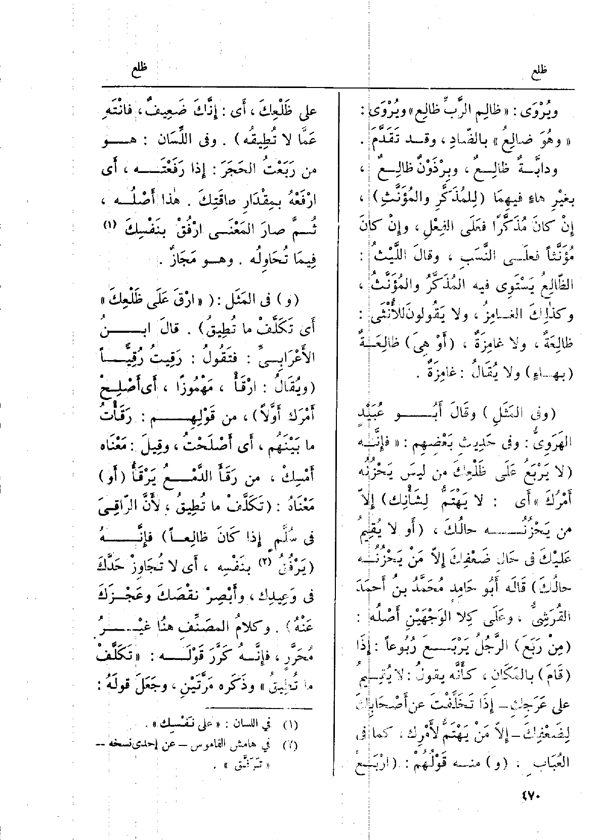 ويُروَى: ظالِم الرَّبِّ ظالِع، ويُروَى: وهُوَ ضالِعُ، بالضَّادِ، وَقد تقدَّمَ. ودابَّةٌ ظالِعٌ، وبِرْذَوْنٌ ظالِعٌ، بِغَيْر هاءٍ فيهِما للمُذَكَّر والمؤَنَّث، إِن كانَ مُذَكَّراً فعلى الفِعْلِ، وَإِن كَانَ مؤَنَّثاً فعلى النَّسَبِ، وَقَالَ الليثُ: الظَّالِعُ يَستوي فِيهِ المُذَكَّرُ والمؤَنَّثُ، وكذلكَ الغامِزُ، وَلَا يقولونَ للأُنْثَى: ظالِعَةٌ وَلَا غامِزَةٌ، أَو هِيَ ظالِعَةٌ بهاءٍ، وَلَا يُقال: غامِزَةٌ. وَفِي المَثَلِ، وَقَالَ أَبو عُبيدٍ الهَرَوِيُّ: وَفِي حديثِ بعضِهِم: فإنَّهُ لَا يَرْبَعُ على ظَلْعِكَ من لَيْسَ يَحزُنُه أَمرُكَ، أَي لَا يَهتَمُّ لِشأْنِكَ إلاّ مَن يَحزُنُه حالُكَ، أَو لَا يُقيمُ عليكَ فِي حالِ ضَعفِكَ إلاّ مَن يَحزُنُه حالُكَ، قَالَه أَبو حامِدٍ محمَّد بنُ أَحمدَ القُرَشِيُّ، وعَلى كلا الوَجهَينِ أَصلُه: مِنْ رَبَعَ الرَّجُلُ يَرْبَعُ رُبوعاً: إِذا قامَ بالمكانِ، كأَنَّه يَقُول: لَا يُقيمُ على عَرْجِكَ، إِذا تخلَّفْتَ عَن أَصحابِكَ لِضَعفِكَ، إلاّ مَن يَهتَمُّ لأَمرِكَ، كَمَا فِي العُبابِ، مِنْهُ قولُهُم: ارْبَعْ على ظَلْعِكَ، أَي إنَّكَ ضَعيفٌ، فانتَهِ عَمَّا لَا تُطيقُه. وَفِي اللِّسان: هُوَ من رَبَعْتُ الحَجَرَ: إِذا رفعْتَه، أَي ارْفَعْهُ بمِقدارِ طاقَتِكَ. هَذَا أَصلُه، ثمَّ صارَ المَعنى ارْفُقْ بنفسِكَ فِيمَا تُحاوِلُه، وَهُوَ مَجازٌ. فِي المَثَل: ارْقَ على ظَلْعِكَ، أَي تكَلَّفْ مَا تُطيقُ، قَالَ ابْن الأَعْرابِيّ: فَتَقول: رَقِيتُ رُقِيّاً، وَيُقَال: ارْقأْ، مَهموزاً، أَي أَصلِحْ أَمرَكَ أَوّلاً، من قَولِهِم: رَقأْتُ مَا بينَهُم، أَي أَصلَحْتُ، وَقيل: مَعْنَاهُ أَمْسِكْ، من رَقأَ الدَّمْعُ يَرْقأُ. أَو مَعناه: تكَلَّفْ مَا تُطيقُ، لأَنَّ الرَّاقِيَ فِي سُلَّمٍ إِذا كَانَ ظالِعاً فإنَّه يَرْفُقُ بنفسِهِ، أَي لَا تُجاوِزْ حَدَّكَ فِي وَعيدِكَ، وأَبْصِر نَقصَكَ وعَجْزَك عَنهُ، وكلامُ المُصنِّف هُنَا غيرُ محرَّرٍ، فإنَّه كَرَّرَ قولَه: تَكَلَّفْ مَا تُطيقُ وذكَرَه مرَّتَينِ، وجعلَ قولَهُ: