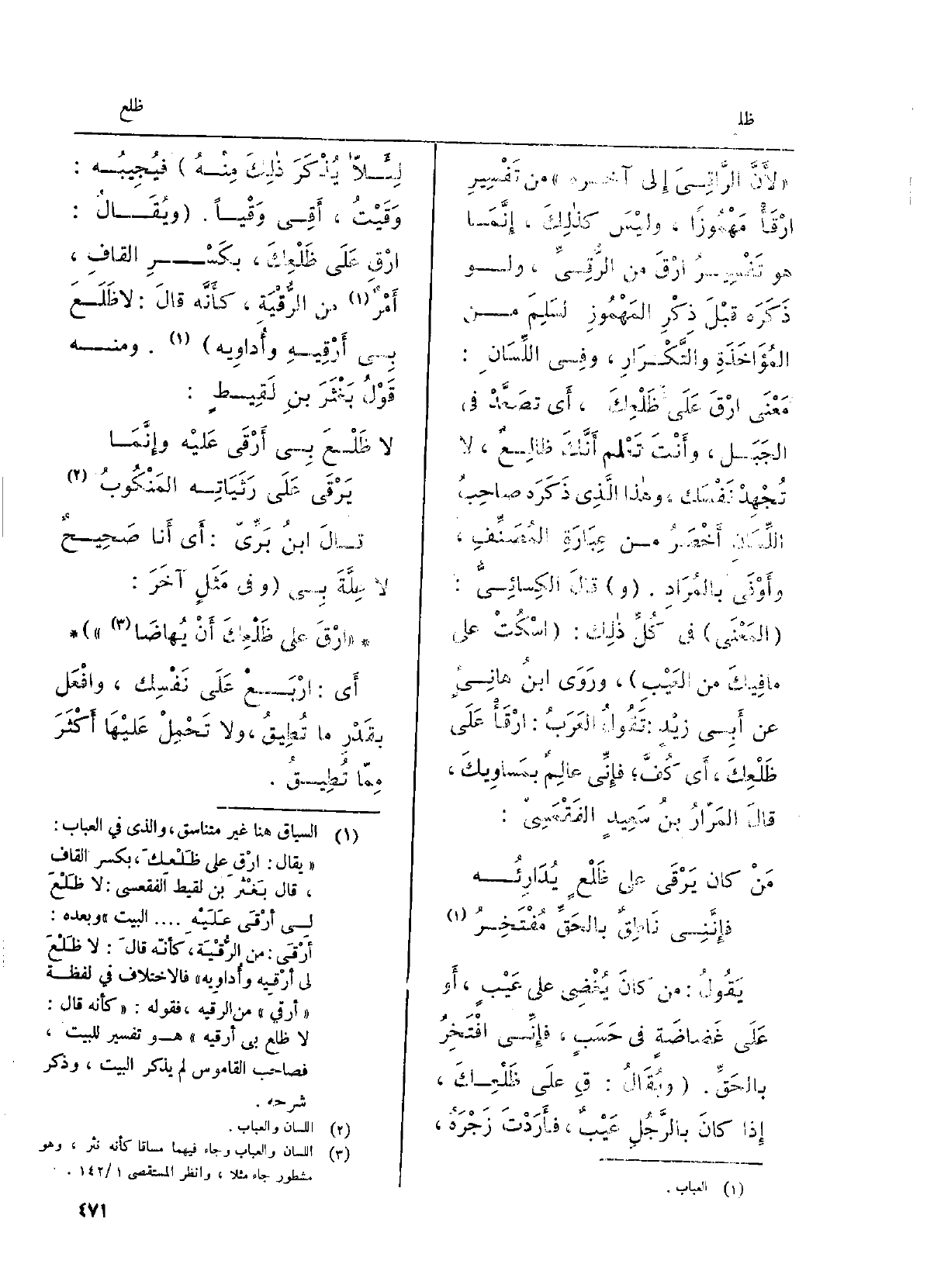 لأَنَّ الرَّاقِيَ إِلَى آخِرِه، من تَفْسِير ارْقأْ مَهْموزاً، وَلَيْسَ كذلكَ، إنَّما هُوَ تَفْسِير ارْقٌ من الرُّقِيِّ، وَلَو ذكرَهُ قبل ذِكْرِ المَهموزِ لَسَلِمَ من المُؤاخَذَةِ والتَّكرار، وَفِي اللِّسانِ: معنى ارْقَ على ظَلْعِكَ، أَي تَصَعَّد فِي الجَبَل، وأنتَ تعلم أَنَّكَ ظالِعٌ، لَا تُجهِدْ نفسَكَ، وَهَذَا الَّذِي ذكرَه صاحِبُ اللسانِ أَخصَرُ من عِبارَةِ المُصنِّفِ، وأَوفى بالمُرادِ. قَالَ الكِسائيُّ: المَعنى فِي كُلِّ ذلكَ: اسْكُتْ على مَا فيكَ من العيبِ، وروَى ابنُ هانِئٍ عَن أَبي زَيدٍ: تَقولُ العَرَبُ: ارْقأْ على ظَلْعِكَ، أَي كُفَّ فإنِّي عالِمٌ بمساوِيكَ، قَالَ المَرَّارُ بنُ سعيدٍ الفَقْعَسِيّ: