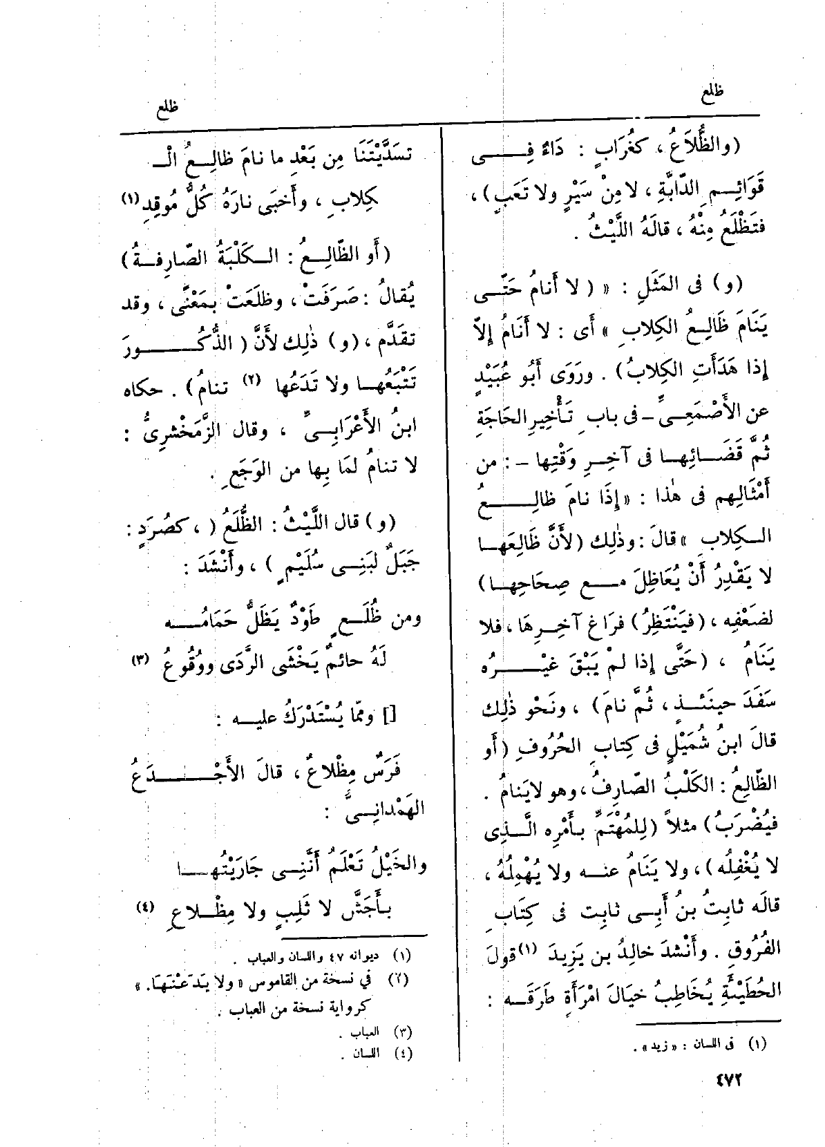 والظُّلاع، كغُرابٍ: داءٌ فِي قَوائمِ الدّابّةِ، لَا من سَيْرٍ وَلَا تَعَبٍ، فَتَظْلَعُ مِنْهُ، قَالَه اللَّيْث. فِي المثَل: لَا أنامُ حَتَّى ينامَ ظالِعُ الْكلاب. أَي: لَا أنامُ إلاّ إِذا هَدَأَتِ الكلابُ. وروى أَبُو عُبَيْدٍ عَن الأَصْمَعِيّ فِي بابِ تأخيرِ الحاجةِ ثمّ قضائِها فِي آخِرِ وَقْتِها: من أمثالِهم فِي هَذَا: إِذا نامَ ظالِعُ الكلابِ قَالَ: وَذَلِكَ لأنّ ظالِعَها لَا يقدِرُ أَن يُعاظِلَ مَعَ صِحاحِها لضَعفِه، فينتَظِرُ فَراغَ آخِرِها، فَلَا ينَام، حَتَّى إِذا لم يبقَ غيرُه سَفَدَ حينَئذٍ، ثمّ نَام، وَنَحْو ذَلِك قَالَ ابنُ شُمَيْلٍ فِي كتاب الْحُرُوف أَو الظالِع: الكلبُ الصّارِف، وَهُوَ لَا ينَام. فيُضرَبُ مثَلاً للمُتَّهَمِ بأمرِه الَّذِي لَا يُغفِلُه، وَلَا ينامُ عَنهُ وَلَا يُهمِلُه، قَالَه ثابتُ بن أبي ثَابت فِي كتاب الفُروق، وأنشدَ خالدُ بن يَزيد قولَ الحُطَيْئةِ يُخاطِبُ خَيالَ امرأةٍ طَرَقَه: تسَدَّيْتَنا من بَعْدِ مَا نامَ ظالِعُ الكلابِ، وأَخبى نارَه كلُّ مُوقِدِ أَو الظالِع: الكَلبةُ الصارِفةُ يُقَال: صَرَفَتْ، وظَلَعَتْ بِمَعْنى، وَقد تقدّم، ذَلِك لأنّ الذُّكورَ تَتْبَعُها وَلَا تدَعُها تنام. حَكَاهُ ابْن الأَعْرابِيّ، وَقَالَ الزَّمَخْشَرِيّ: لَا تنامُ لما بهَا من الوجَع. قَالَ الليثُ: الظُّلَع، كصُرَدٍ: جبَلٌ لبَني سُلَيْمٍ، وأنشدَ: