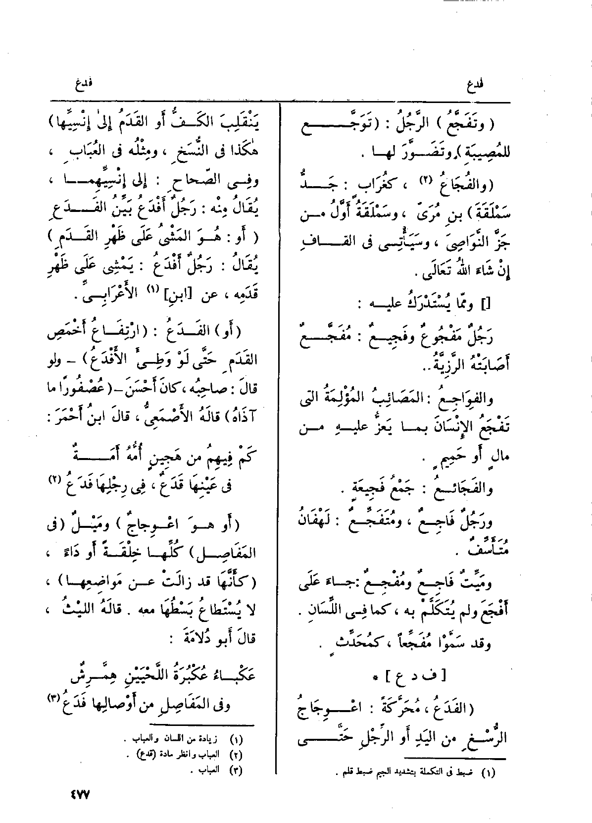 الفَدَع، مُحرّكةً: اعْوِجاجُ الرُّسْغِ من اليَدِ أَو الرِّجلِ حَتَّى يَنْقَلِبَ الكَفُّ أَو القدَمُ إِلَى إنْسِيِّها هَكَذَا فِي النّسخ، ومِثلُه فِي العُباب، وَفِي الصِّحَاح: إِلَى إنْسِيِّهِما، يُقَال مِنْهُ: رجلٌ أَفْدَعُ بَيِّنُ الفَدَعِ أَو: هُوَ المَشْيُ على ظَهْرِ القدَمِ، يُقَال: رجلٌ أَفْدَعُ، يَمْشِي على ظَهْرِ قَدَمِه، عَن ابْن الأَعْرابِيّ. أَو الفَدَع: ارتِفاعُ أَخْمَصِ القدَمِ حَتَّى لَو وَطِئَ الأَفْدَعُ وَلَو قَالَ: صاحِبُه، كَانَ أَحْسَن عُصفوراً مَا آذاه قَالَه الأصمعيُّ، قَالَ ابنُ أَحْمَرَ: