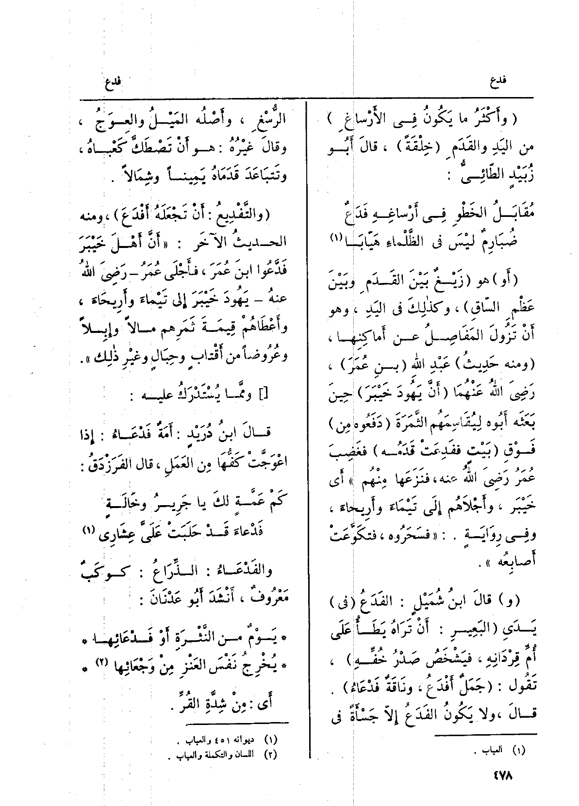 أَو هُوَ زَيْغٌ بَين القدَمِ وبينَ عَظْمِ السَّاق، وَكَذَلِكَ فِي اليدِ، وَهُوَ أَن تَزولَ المَفاصِلُ عَن أماكِنِها، وَمِنْه حديثُ عَبْد الله بن عمر، رَضِيَ الله عَنْهُمَا أنّ يَهودَ خَيْبَرَ حِين بَعَثَه أَبوهُ ليُقاسِمَهُم الثمَرةَ دفَعوه من فوقِ بيتٍ ففَدِعَتْ قدَمُه، فغَضِبَ عمرُ رَضِيَ الله عَنهُ، فَنَزَعها مِنْهُم أَي خَيْبَرَ، وأَجْلاهُم إِلَى تَيْمَاءَ وأَريحاء، وَفِي روايةٍ: فسَحَروه، فَتَكَوَّعَتْ أصابِعُه. قَالَ ابنُ شُمَيْلٍ: الفَدَع فِي يَدَيِ البعيرِ: أَن تراهُ يَطَأُ على أمِّ قِرْدانِه، فَيَشْخَصُ صَدْرُ خُفِّه، تَقول: جَمَلٌ أَفْدَعُ، وناقةٌ فَدْعَاء. قَالَ: وَلَا يكونُ الفَدَعُ إلاّ جَسْأَةً فِي الرُّسْغِ، وأصلُه المَيلُ والعِوَجُ، وَقَالَ غيرُه: هُوَ أَن تَصْطَكَّ كَعْبَاهُ وتَتباعَدَ قَدَمَاه يَميناً وشِمالاً. والتَّفْديع: أَن تَجْعَله أَفْدَعَ، وَمِنْه الحديثُ الآخَر: أنّ أهلَ خَيْبَرَ فَدَّعوا ابنَ عمرَ، فَأَجْلى عمرُ رَضِيَ الله عَنهُ يهودَ خَيْبَرَ إِلَى تَيْمَاءَ وأَريحاء، وَأَعْطَاهُمْ قِيمَةَ ثمَرِهم مَالا وإبِلاً وعُروضاً من أَقْتَابٍ وحِبالٍ وغيرِ ذَلِك. ومِمّا يُسْتَدْرَك عَلَيْهِ: قَالَ ابْن دُرَيْدٍ: أَمَةٌ فَدْعَاءُ: إِذا اعْوَجَّتْ كَفُّها من العمَل، قَالَ الفرَزْدَقُ: