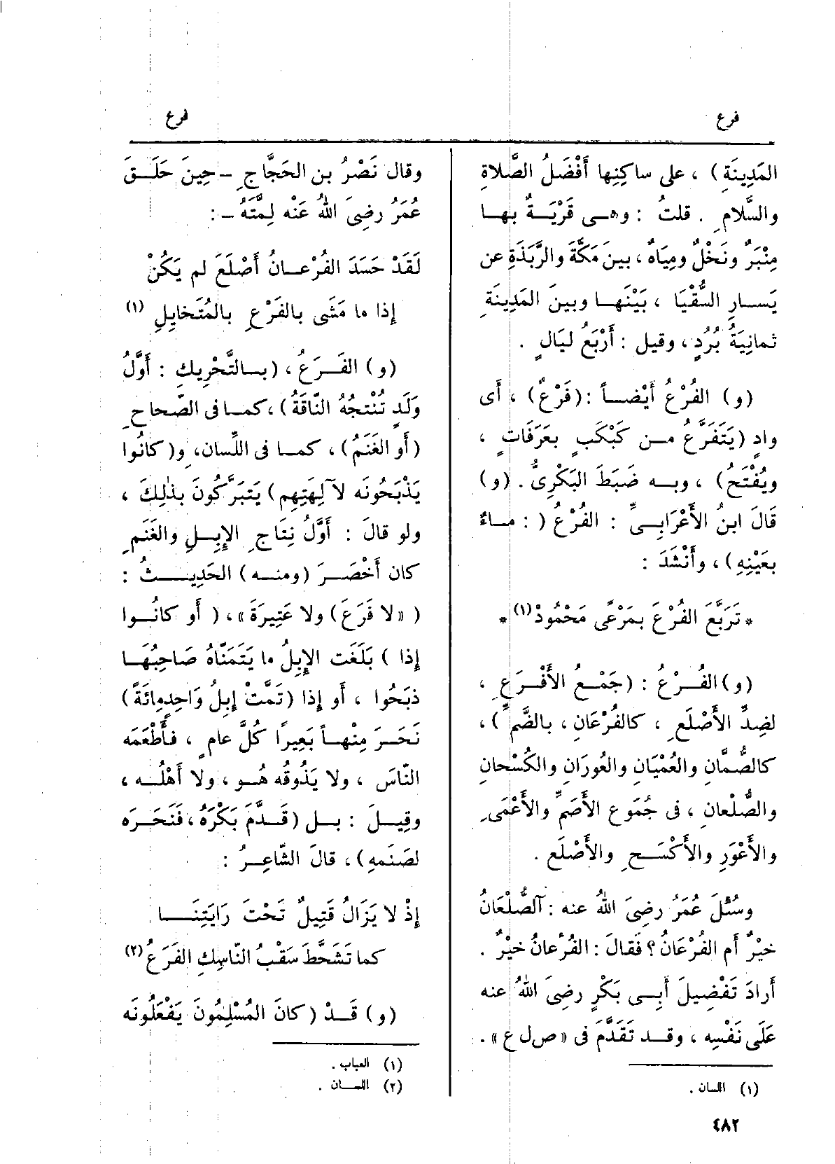المَدينةِ، على ساكِنِها أَفضَلُ الصَّلاة والسَّلام. قلتُ: وَهِي قريَةٌ بهَا مِنبَرٌ ونَخْلٌ ومِياهٌ، بَين مكَّةَ والرَّبَذَةِ عَن يسارِ السُّقيا، بَينهمَا وَبَين الْمَدِينَة ثمانيةُ بُرُدٍ، وَقيل: أَربَعُ ليالٍ. الفُرْعُ أَيضاً: فَرْعٌ، أَي وادٍ يتفرَّعُ من كَبْكَبٍ بعرَفاتٍ، ويُفتَحُ، وَبِه ضَبَطَ البَكرِيُّ. قَالَ ابْن الأَعْرابِيّ: الفُرْعُ: ماءٌ بعينِه، وأَنشدَ: تَرَبَّعَ الفُرْعُ بِمَرْعىً مَحمودْ الفُرْعُ: جمعُ الأَفْرَعِ، لِضِدِّ الأَصْلَعِ، كالفُرعانِ، بالضَّمِّ، كالصُّمّانِ والعُميانِ والعُورانِ والكُسْحانِ والصُّلْعانِ، فِي جموع الأَصَمِّ والأَعمى، والأَعوَرِ والأَكْسَحِ والأَصْلَعِ. وسُئلَ عُمرُ رَضِي الله عَنهُ: آلصُّلْعانُ خَيرٌ أَم الفُرْعانُ فَقَالَ: الفُرعانُ خَيرٌ. أَرادَ تفضيلَ أبي بَكْرٍ رَضِي الله عَنهُ على نفسِه، وَقد تقدَّم فِي صلع. وَقَالَ نصرُ بنُ الحَجّاجِ، حينَ حلَقَ عمَرُ رَضِي الله عَنهُ لِمَّتَهُ: