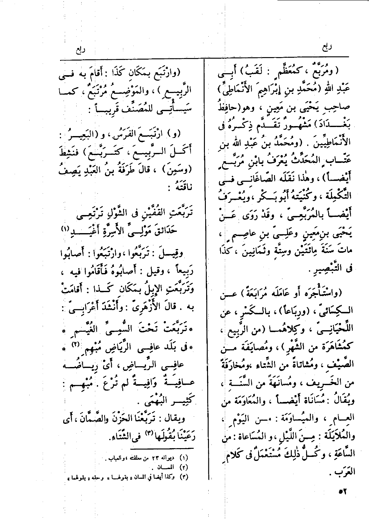 ومُرَبَّعٌ، كمُعَظَّمٍ: لقَبُ أبي عَبْد الله مُحَمَّد بن إبراهيمَ الأَنْماطيِّ صاحبِ يحيى بن مَعينٍ، وَهُوَ حافظُ بغدادَ مَشْهُورٌ تقدّم ذِكرُه فِي الأَنْماطِيِّين. وَمُحَمّد بن عَبْد الله بن عَتّابٍ المُحدِّثُ يُعرَفُ بابنِ مُرَبَّعٍ أَيْضا، وَهَذَا نَقَلَه الصَّاغانِيّ فِي التكملة، وكُنيَتُه أَبُو بكر، ويُعرَفُ أَيْضا بالمُرَبَّعيّ، وَقد روى عَن يحيى بن مَعينٍ وعليّ بن عاصمٍ، مَاتَ سنةَ مائتَيْن وستّةٍ وثَمانين، كَذَا فِي التَّبصير. واسْتأْجَره أَو عامَلَه مُرابَعَةً عَن الكِسائيّ، ورِباعاً، بالكَسْر، عَن اللِّحْيانيّ، وكِلاهُما من الرَّبيع، كمُشاهَرَة من الشَّهْر، ومُصايَفَة من الصَّيف، ومُشاتاة من الشتَاء، ومُخارَفَةً من الخريف، ومُسانَهَةً من السَّنَة، وَيُقَال: مُساناة أَيْضا، والمُعاوَمَة من الْعَام، والمُياوَمَة: من الْيَوْم، والمُلايَلَة: من اللَّيْل، والمُساعاة: من السَّاعَة، وكلُّ ذَلِك مُستعمَلٌ فِي كلامِ الْعَرَب. وارْتَبَعَ بمكانِ كَذَا: أقامَ بِهِ فِي الرّبيع، والمَوضِعُ مُرْتَبَعٌ، كَمَا سَيَأْتِي للمُصنِّف قَرِيبا. ارْتَبَعَ الفرَسُ، والبَعيرُ: أَكَلَ الرَّبيعَ، كَتَرَبَّعَ فنَشِطَ وسَمِنَ، قَالَ طَرَفَةُ بنُ العَبدِ يصفُ ناقتَه: