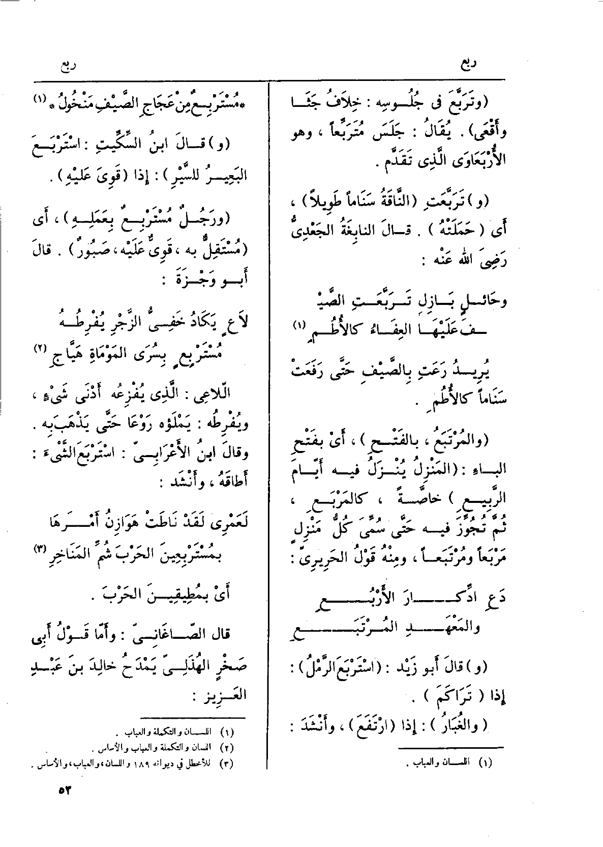 قَالَ أَبُو زَيْدٍ: اسْتَرْبَعَ الرَّملُ: إِذا تراكَم. والغُبار: إِذا ارتفعَ، وَأنْشد: مُسْتَرْبِعٌ مِن عَجَاجِ الصيفِ مَنْخُولُ قَالَ ابْن السِّكِّيت: اسْتَربعَ البعيرُ للسَّيْرِ: إِذا قَوِيَ عَلَيْهِ. ورجلٌ مُسْتَربَعٌ بعَملِه، أَي مُستَقِلٌّ بِهِ، قَوِيٌّ عَلَيْهِ، صَبُورٌ. قَالَ أَبُو وَجْزَة: