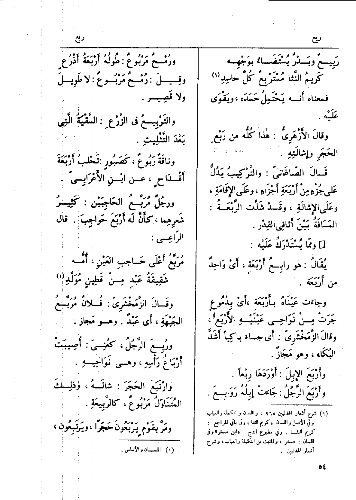 فَمَعْنَاه أنّه يَحْتَملُ حَسَدَه، ويَقْوَى عَلَيْهِ. وَقَالَ الأَزْهَرِيّ: هَذَا كلُّه من رَبْعِ الحجَرِ وإشالَتِه. قَالَ الصَّاغانِيّ: والتركيبُ يدُلُّ على جُزْءٍ من أَرْبَعةِ أَجْزَاءٍ، وعَلى الإقامةِ، وعَلى الإشالة، وَقد شَذَّت الرَّبْعَة: المَسافةُ بَيْنَ أثافِي القِدْر. ومِمّا يُسْتَدْرَك عَلَيْهِ: يُقَال: هُوَ رابِعُ أَرْبَعةٍ، أَي واحدٌ من أَرْبَعة. وجاءَت عَيْنَاهُ بأَرْبَعَةِ، أَي بدُموعٍ جَرَتْ من نواحي عَيْنَيْه الأَرْبَع، وَقَالَ الزَّمَخْشَرِيّ: أَي جاءَ باكياً أشَدَّ البُكاء. وَهُوَ مَجاز. وأَرْبَعَ الإبلَ: أَوْرَدَها رِبْعاً. وأَرْبَعَ الرجلُ: جاءَتْ إبلُه رَوابِعَ. ورُمْحٌ مَرْبُوعٌ: لَا طَويلَ وَلَا قَصير. والتَّرْبيع فِي الزَّرْع: السَّقْيَةُ الَّتِي بَعْدَ التثْليث. وناقةٌ رَبُوعٌ، كصَبُورٍ: تَحْلُبُُ أَرْبَعةَ أَقْدَاحٍ، عَن ابْن الأَعْرابِيّ. ورجلٌ مُرَبَّعُ الحاجِبَيْن: كثيرُ شَعْرِهما، كأنّ لَهُ أَرْبَعَ حَواجِبَ. قَالَ الرَّاعِي: